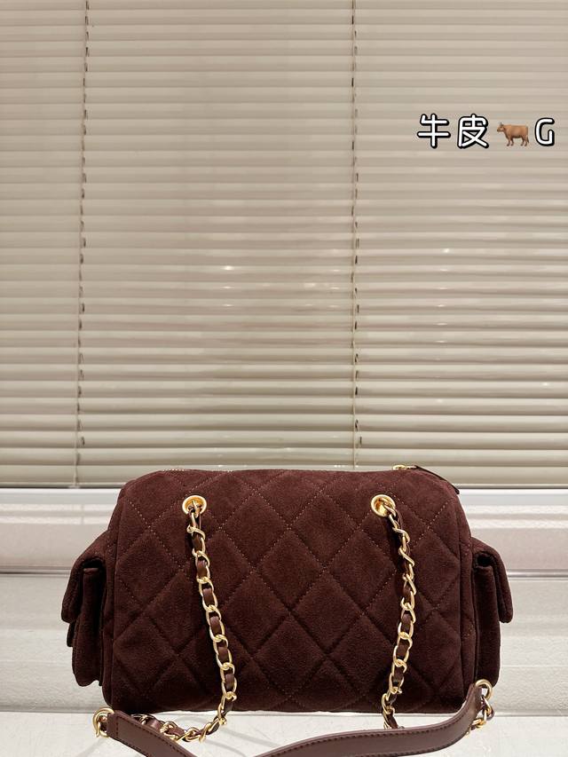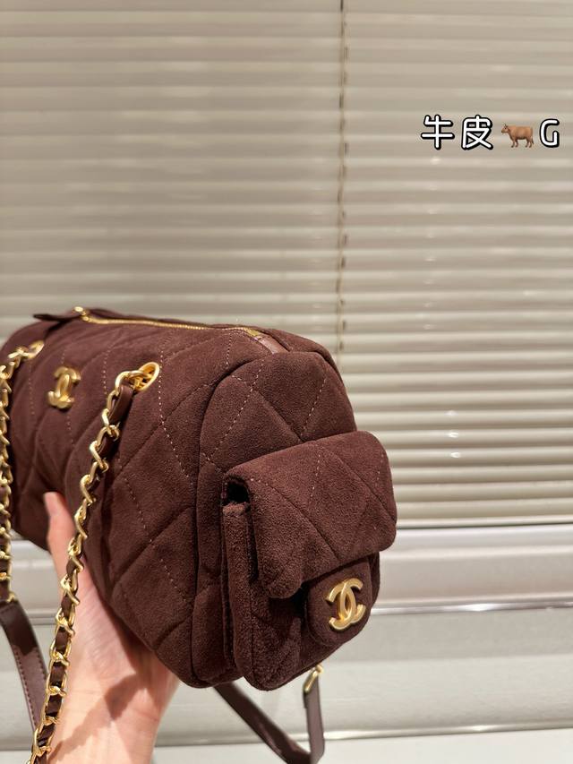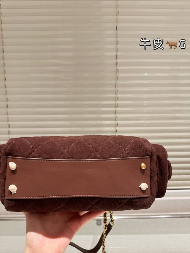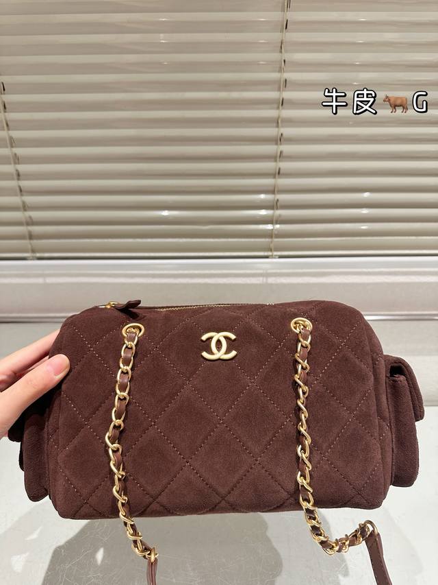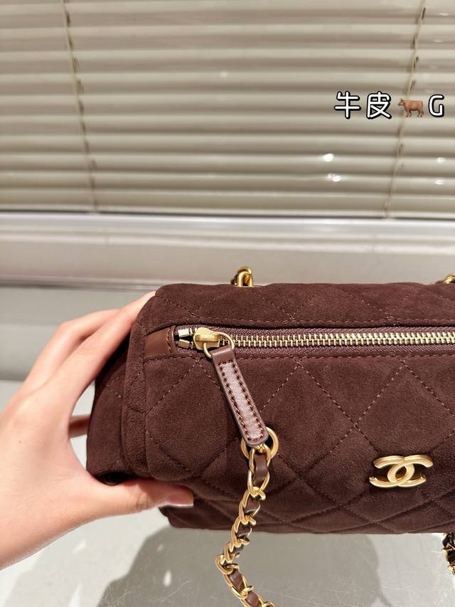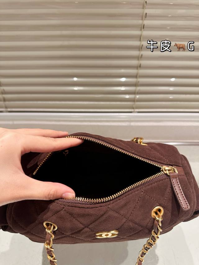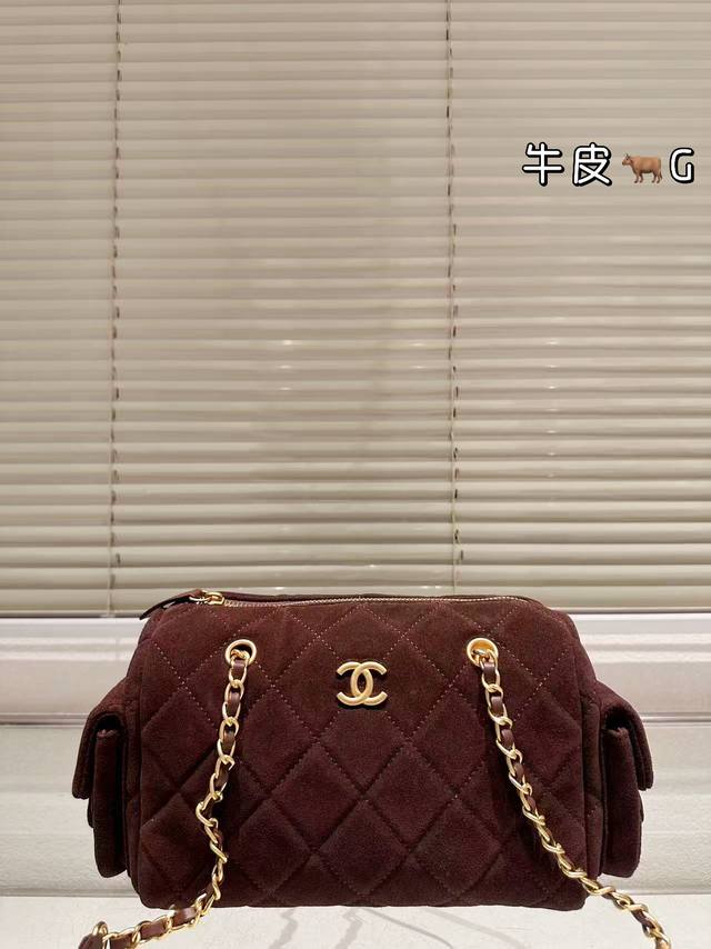 Replica suede Chanel 25K suede bowling bag. Made of suede cowhide with classic quilted pattern, this Chanel 25K suede bowling bag exudes a retro feel! The gold hardware is incredibly high-quality. The chain allows for hand-carrying, shoulder-carrying, or crossbody wear, making it versatile and practical. The small size (15.5 x 24 x 11.5 cm) is just the right capacity, perfect for commuting. Side pockets enhance storage capacity, easily accommodating even thicker autumn and winter coats. The classic black and gold color scheme is timeless and a top choice for long-term wear enthusiasts