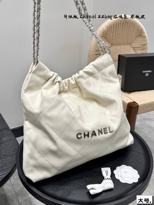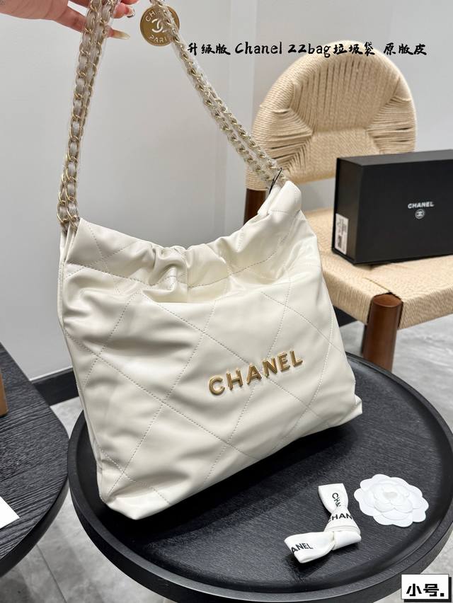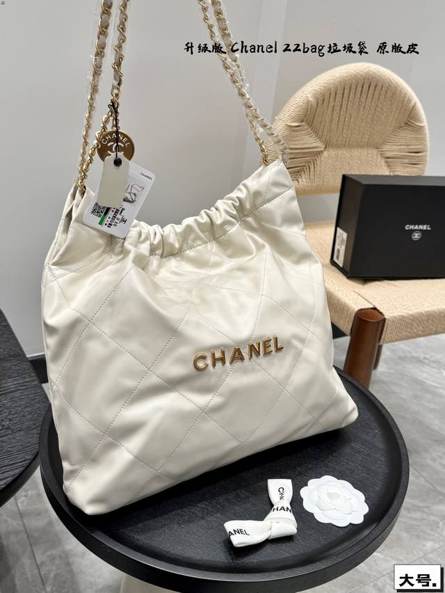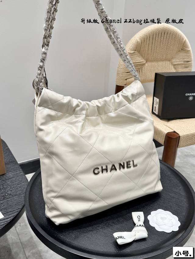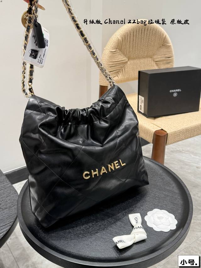 Same price for all sizes, gift box packaging. Size: 32.35 (small), 35.39 (large). Chanel 24C 22Bag trash bags, original Chanel leather. Chain design adds a touch of casualness. Simple appearance with a focus on practicality, visibly spacious. A sophisticated and cool feel, versatile and sweet. Excellent capacity. Retains a relaxed feel while adding a touch of chic and neatness. I'm absolutely smitten with the 22Bag!