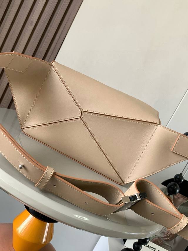Small Classic Calfskin Puzzle Waist Bag. The rectangular shape and precise cutting techniques create Puzzle's unique geometric lines. This small waist bag is made of classic calfskin leather, which is soft and lightweight. Its understated yet distinctive design makes it suitable for both business and casual occasions. Later, I discovered a Puzzle waist bag. Compared to the classic Puzzle, it's relatively niche. This waist bag removes the classic Puzzle's handle and moves the back zippered pocket to the front. The waist belt is also a non-removable buckle. While retaining the classic Puzzle's casual and artistic basic shape, it adds a cool, mechanical feel, remaining classic and versatile. It not only has a considerable capacity but also improves body proportions. It can be worn over the shoulder or crossbody, with an adjustable shoulder strap and a metal buckle closure. Size: 24cm