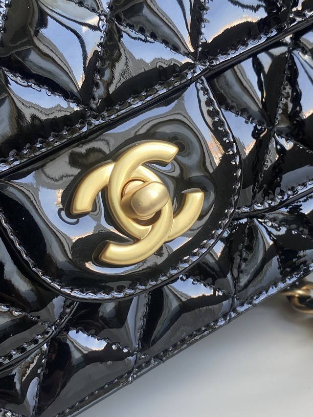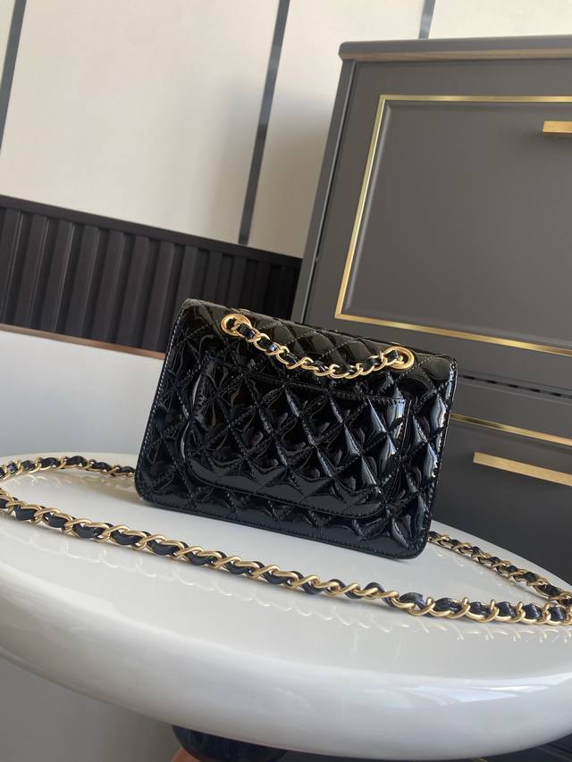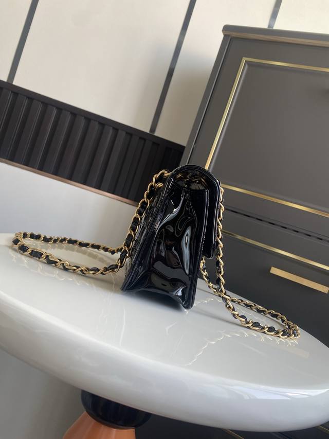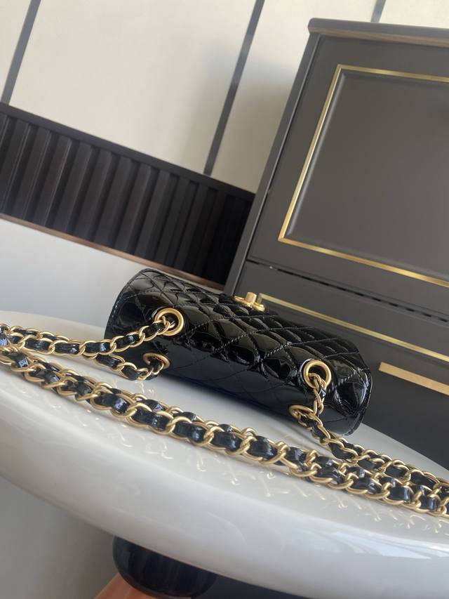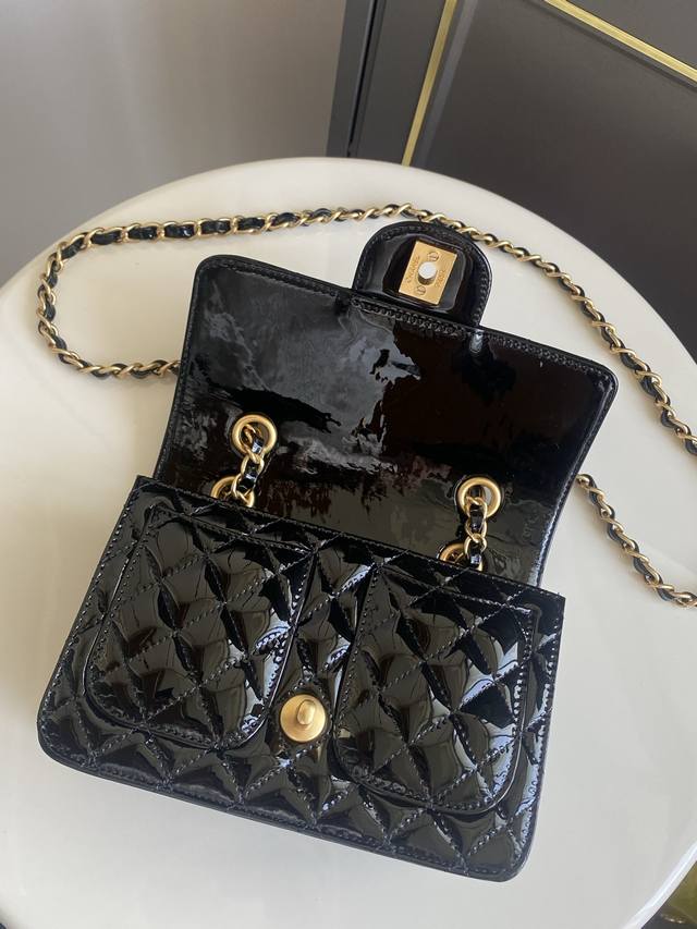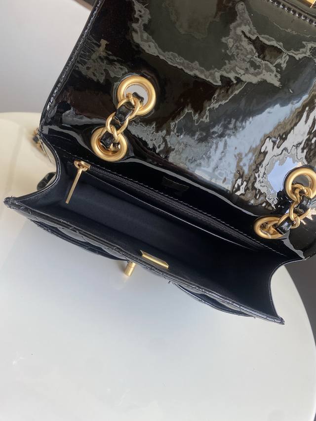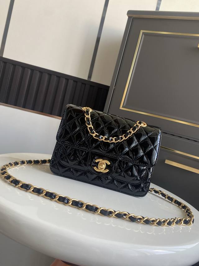 black patent leather Ghw. Very similar to the Mini CF in its diamond quilted design and double C logo, making it highly recognizable! The chain is adjustable, so it can be carried by hand, over the shoulder, or crossbody, making it suitable for everyday commutes or formal occasions. It has a moderate capacity, easily holding a phone, lipstick, and power bank