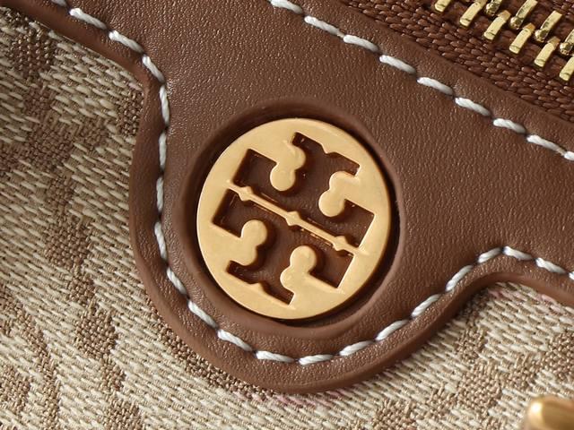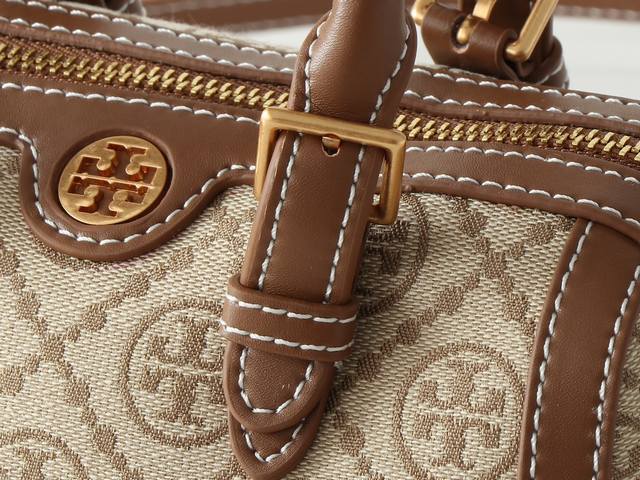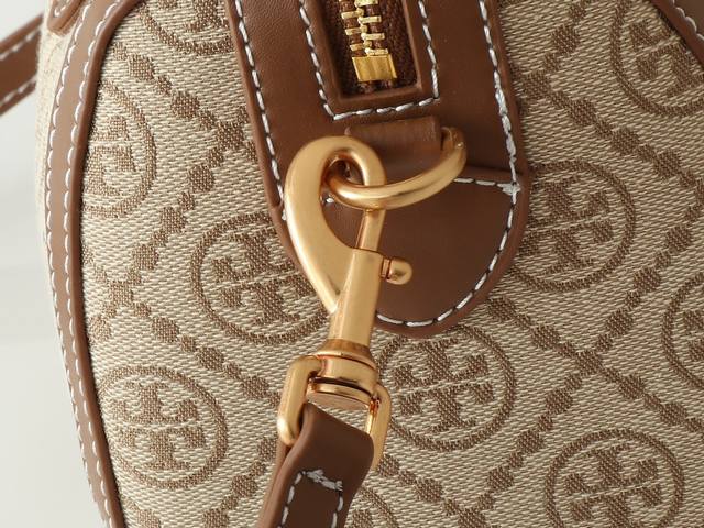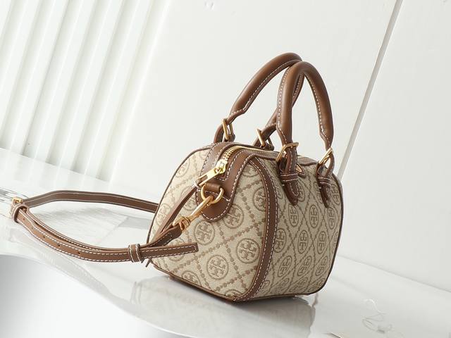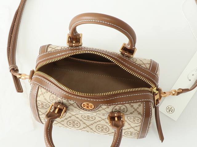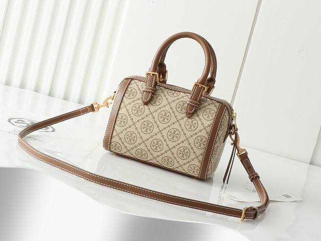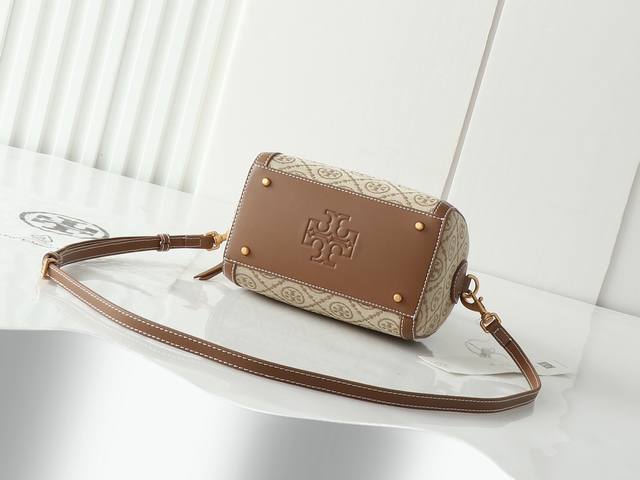 Small original quality new product, pay attention to details. Tory Burch T Monogram mini jacquard barrel bag. This series is crafted from woven jacquard fabric, with timeless charm and unique style. The stitched handles are decorated with buckles. It can be carried on the shoulder or crossbody. New T Monogram series, hazelnut brown. Dimensions: 19-14-12