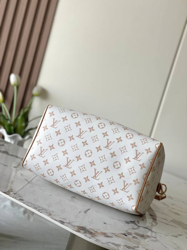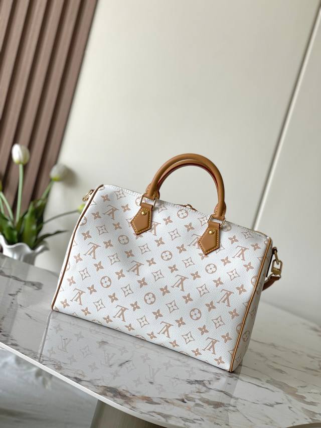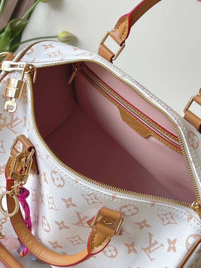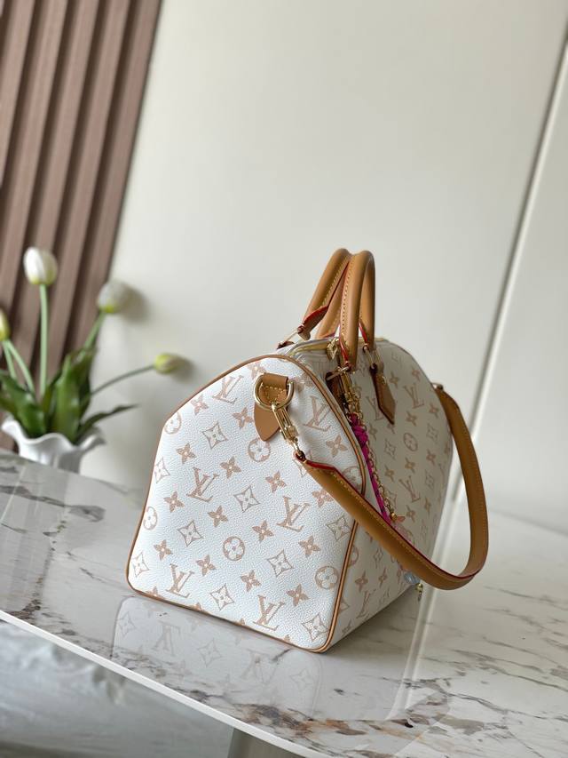 This Speedy Soft 30 Boho handbag is made of classic Monogram coated canvas, with a leather lining and zippered inner pocket injecting color contrast. Ostrich leather trim and beaded chain bring the visual focus, while key pouch and address tag add thoughtful details. The Toron handle allows for multiple carrying options. 30.0 X 21.0 X 17.0 cm Length X Height X Width