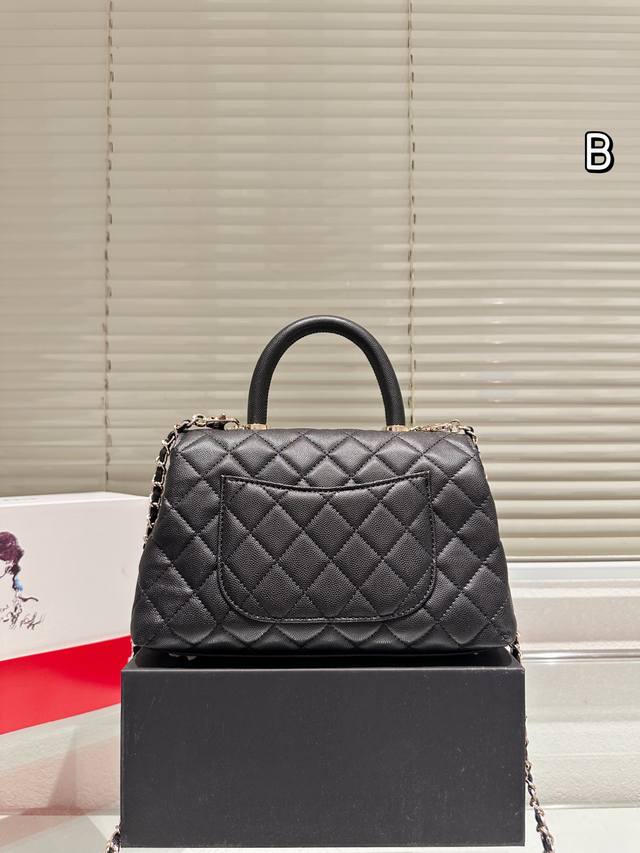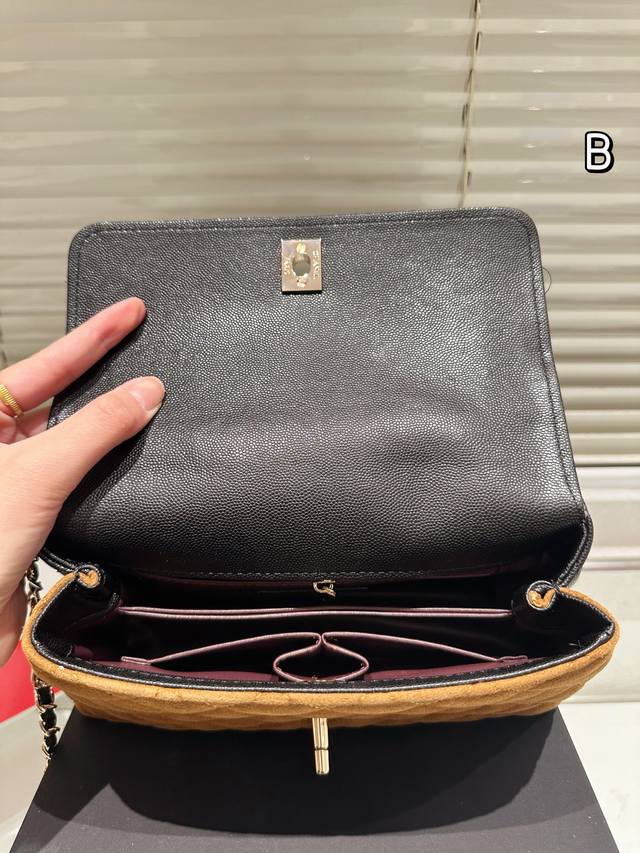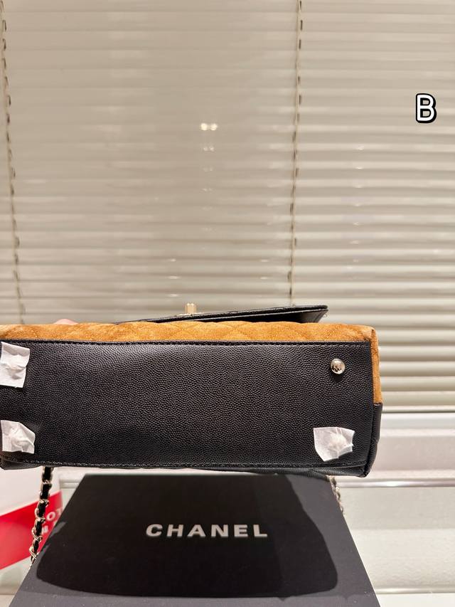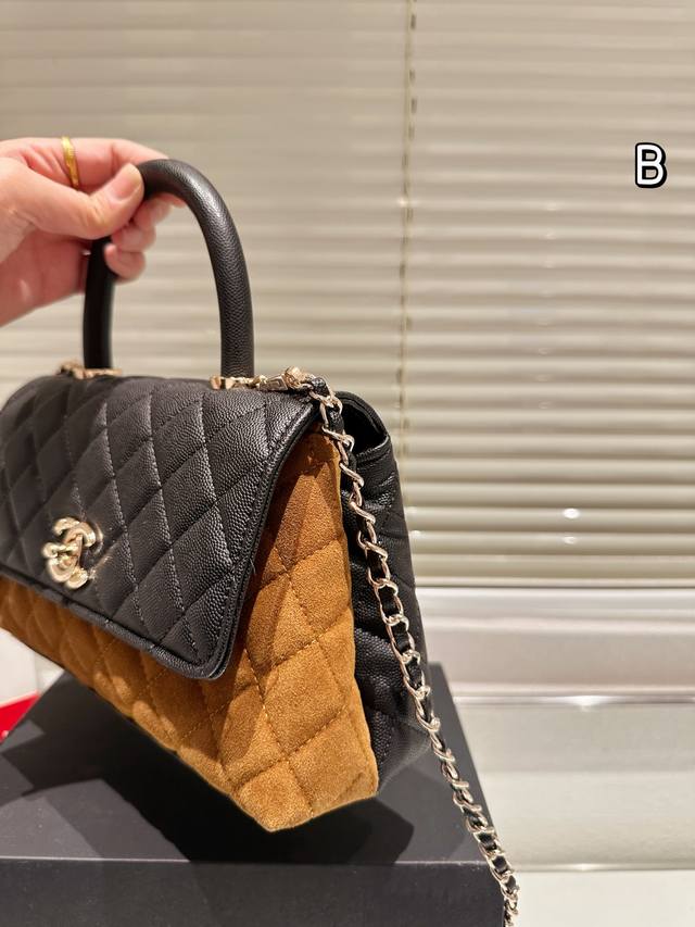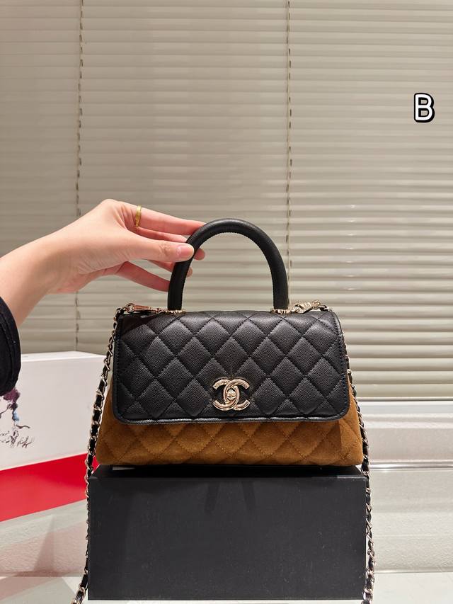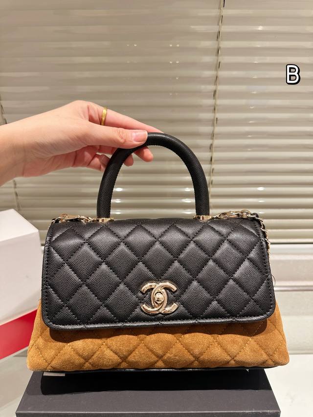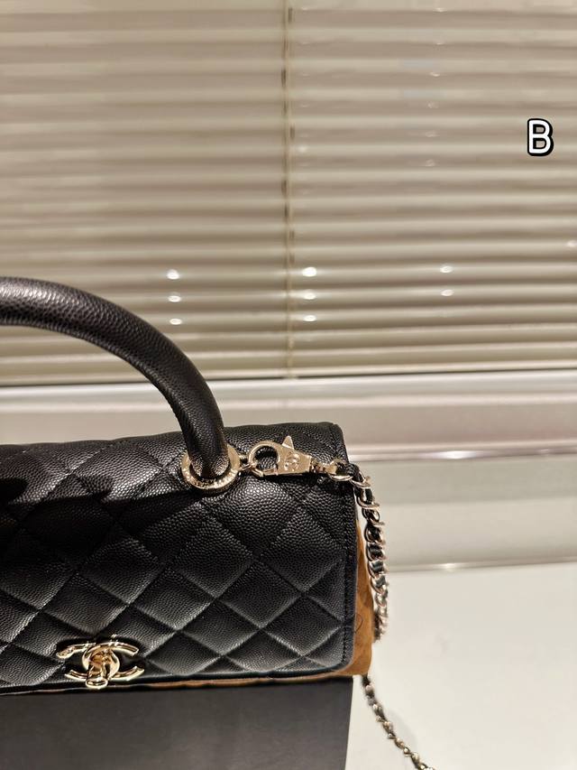 Suede Chanel Coco Handle Mini Handbag. This Chanel Coco Handle Mini handbag features black pebbled calfskin leather with a gold double C logo, exuding retro elegance. The classic quilted pattern and metal chain handle make it versatile enough to be carried by hand or crossbody. Its mini size makes it easy to handle for everyday commutes or evening events. While the interior is small, the layout is well-organized, easily accommodating your phone and cards. The black and gold color scheme and durable pebbled leather make it suitable for both work and dates. A popular Chanel style, its price has remained consistently high. Size: 23 x 14 cm.