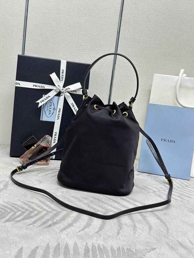 The classic best-selling style 1Bh038 in black has arrived! This bucket bag is made of imported nylon fabric. Nylon is very lightweight and durable. It can be carried by hand or worn crossbody, making it lightweight, practical, and stylish. It features a highly functional design with convenient storage pockets. (Dimensions: Length 18cm x Height 23cm x Base 12cm)