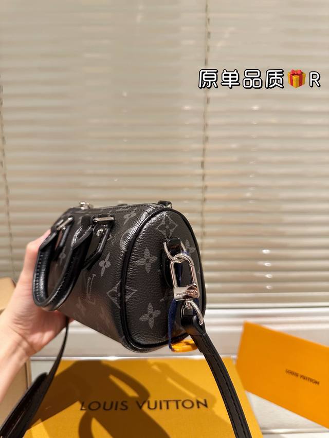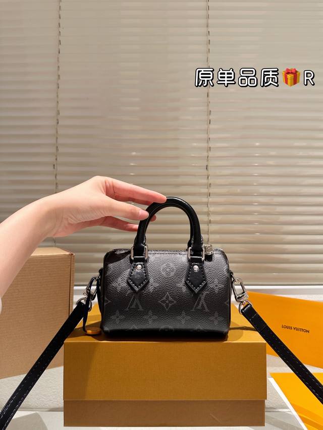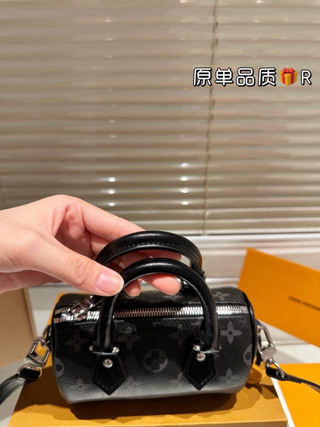 LV Nano Speedy black monogram handbag features Monogram Eclipse coated canvas, exuding understated luxury and a cool, edgy vibe. Its compact size makes it easy to carry by hand or crossbody, and the adjustable strap suits various heights. While the interior is small, it can still hold everyday essentials, making it perfect for autumn and winter! A classic Speedy series item, practical and stylish, it's a popular LV piece and a must-have for cool girls!