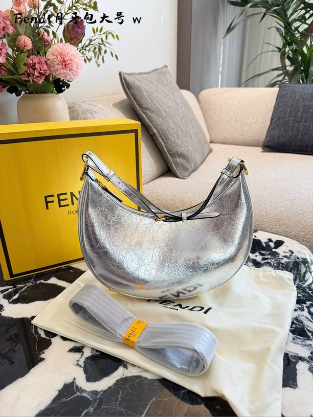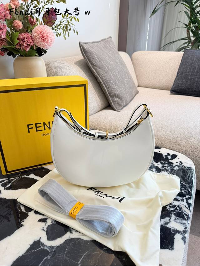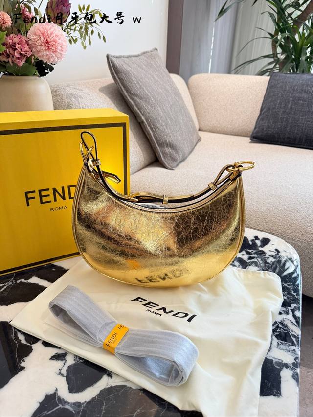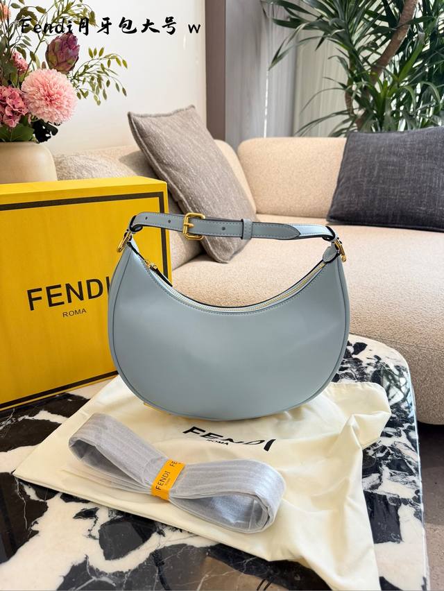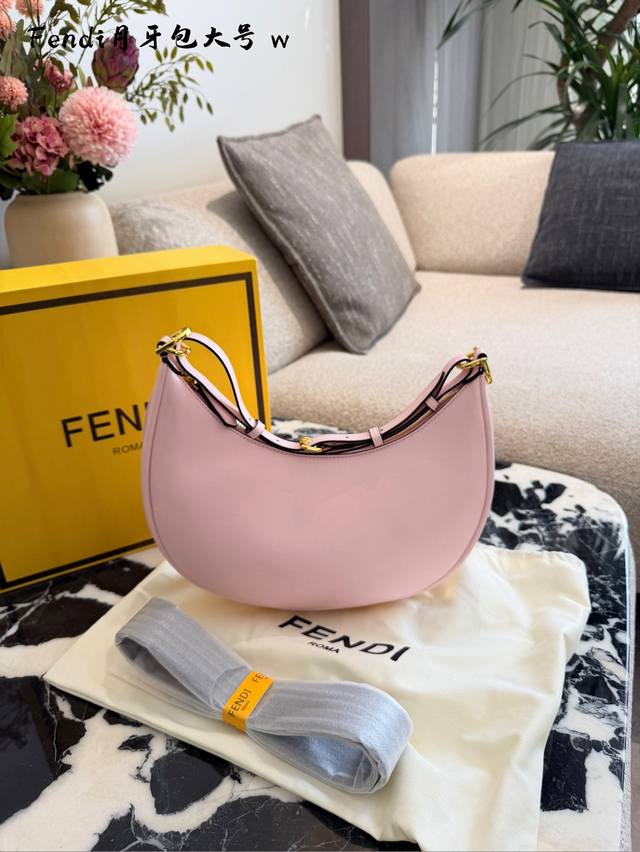 The new Fendi crescent moon shoulder bag is really beautiful, the color scheme is very sophisticated. It's made of durable cowhide leather, and the metal Fendi logo on the bottom adds a touch of class. European 28cm. #Fendi #FendiCrescentBag #FendiShoulderBag #Commuting #FoldingBoxPackaging