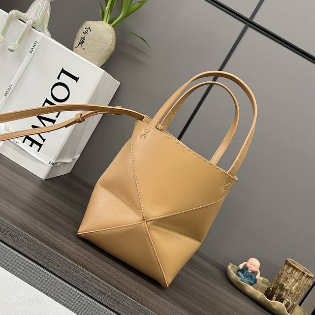 The new Loewe mini Puzzle Fold handbag in glossy calfskin draws inspiration from the geometric lines of the brand's classic handbag collection, reinterpreted with geometrically architectural panels. It can be fully folded, making it a perfect travel companion. The brand has cleverly crafted a soft and lightweight handbag, adorned with the understated elegance of the Loewe logo. This mini version is made of glossy calfskin and can be carried on the shoulder, crossbody, or by hand. It features a detachable and adjustable shoulder strap, suede lining, and Lw gold foil stamping. Size: 16.5*9.5*20cm. Model: 052322.