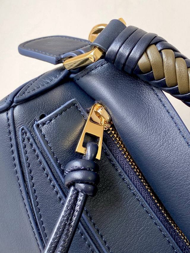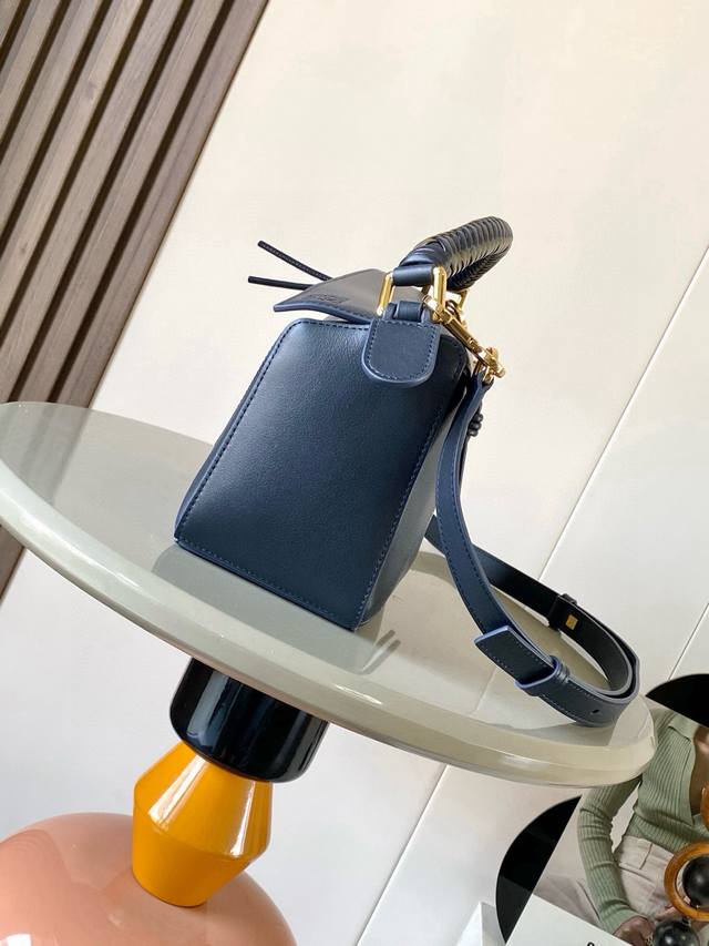 The new small Puzzle handbag in soft calfskin leather is the first tote bag designed by Creative Director Jonathan Anderson. Its rectangular shape and precise cutting techniques create Puzzle's unique geometric lines. This small version is crafted from soft calfskin leather and features a unique woven handle. * This small Puzzle handbag can hold, for example, a large wallet, all-size phones, and sunglasses. It can be worn over the shoulder, crossbody, carried by hand, or held in the hand. Detachable and adjustable shoulder strap. * Zipper closure with calfskin zipper pulls. External zippered back pocket and an internal slip pocket. * Customization is available with shoulder straps and personalized charms. * Suede lining. * Anagram embossing. Size: 24cm