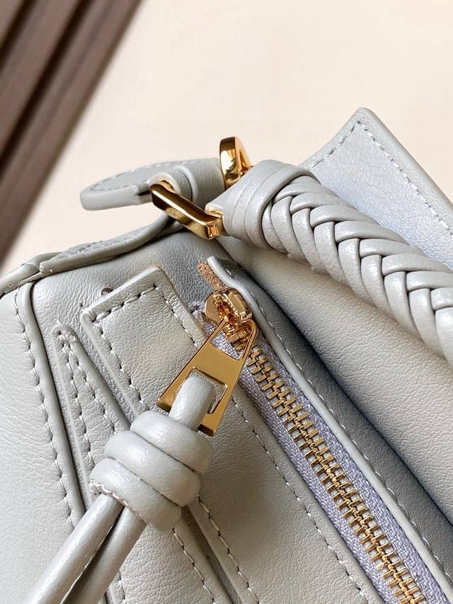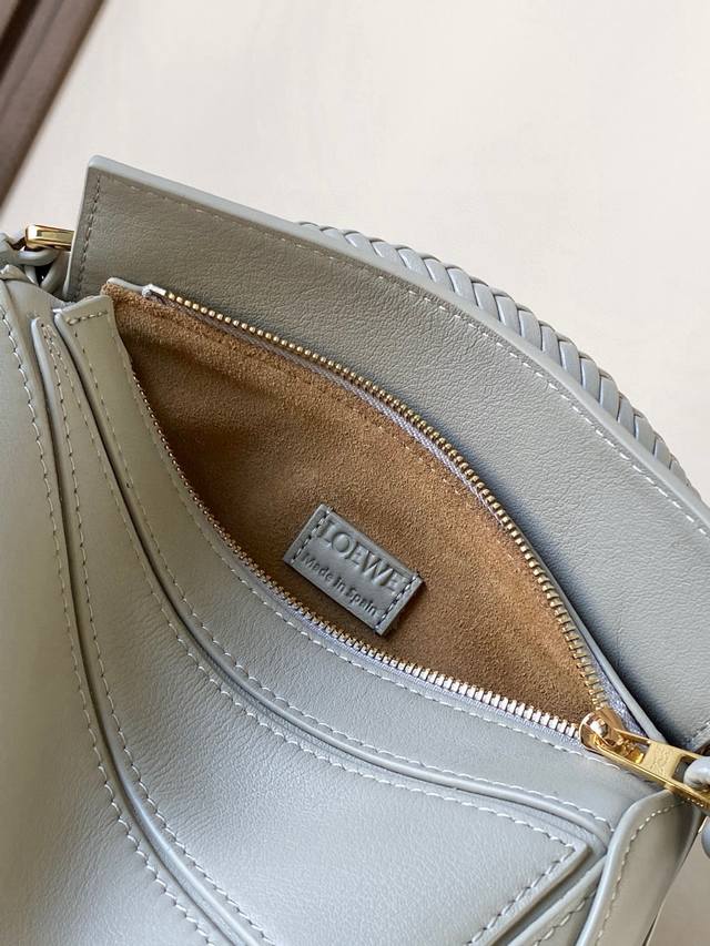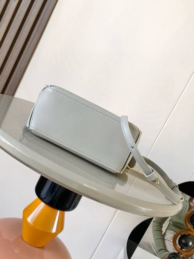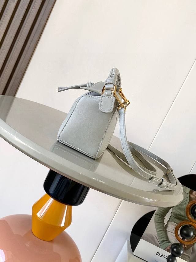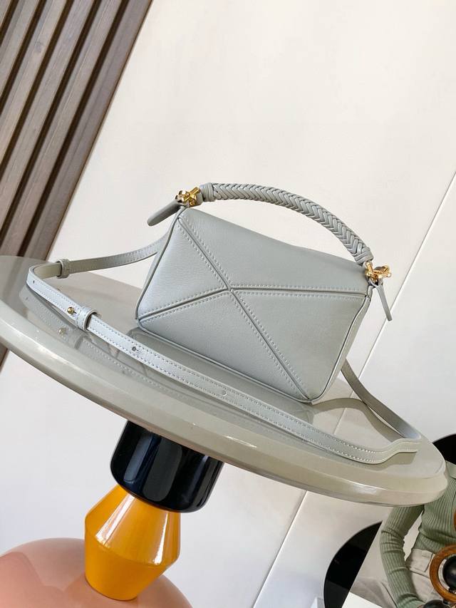 The new woven-handle mini Puzzle bag in soft calfskin leather is the first handbag designed by Creative Director Jonathan Anderson. Its rectangular shape and precise cutting techniques created the unique geometric lines of the Puzzle. This smaller version is crafted from soft calfskin leather and features a unique woven handle. * This small Puzzle bag can hold, for example, a large wallet, all-size phones, and sunglasses. It can be worn over the shoulder, crossbody, carried by hand, or held in the hand. Detachable and adjustable shoulder strap. * Zipper closure with calfskin zipper pulls. External zippered back pocket and one internal slip pocket. * Customization is available with shoulder straps and personalized charms. * Suede lining. * Anagram embossing. Size: 18cm