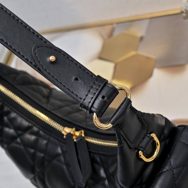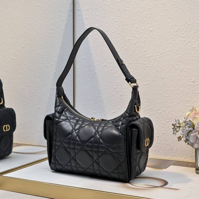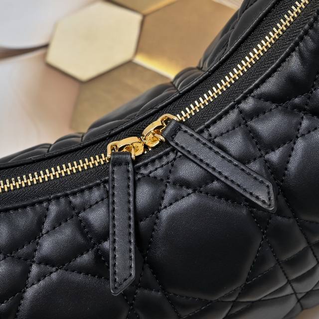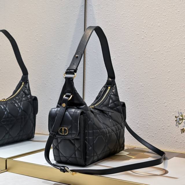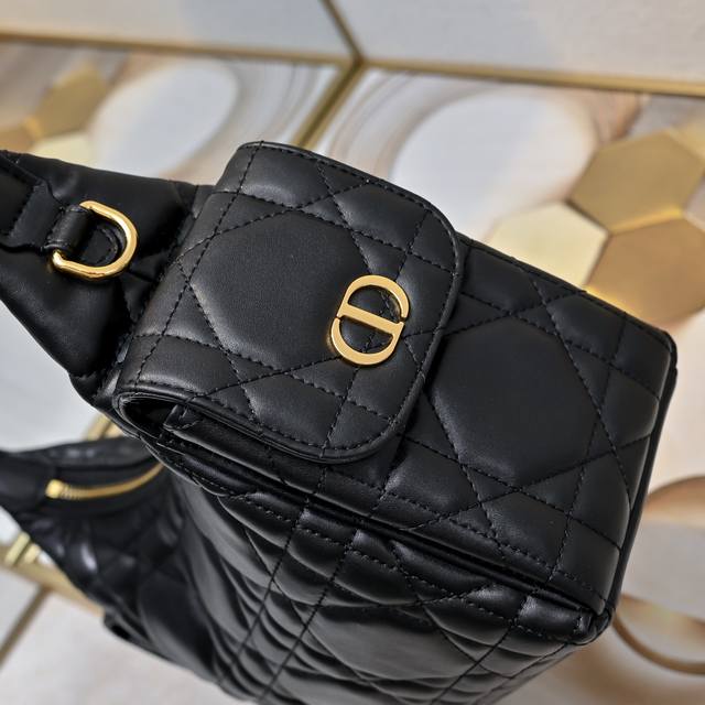 This D-Dream handbag is a new addition to the Fall/Winter 2025 ready-to-wear collection, offering a casual yet modern look without sacrificing practicality. Its soft silhouette is crafted from black lambskin leather and adorned with oversized cannage stitching for added sophistication. A spacious zippered compartment, along with two side pockets featuring magnetic flaps and a gold-tone metal Cd logo, makes it easy to organize various everyday essentials. The medium size features an adjustable top handle and an adjustable, detachable leather shoulder strap, allowing for shoulder or crossbody wear, making it an ideal everyday companion. Dimensions: 28 x 16 x 10 cm (L x H x W). It can hold one wallet, one cardholder, one mobile phone, sunglasses, and a lipstick. Model: M6323