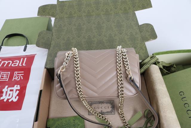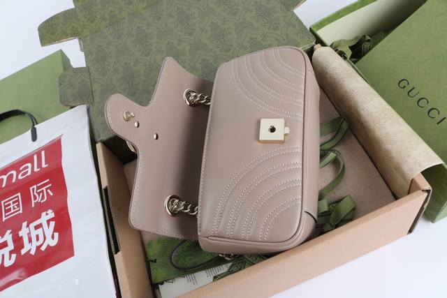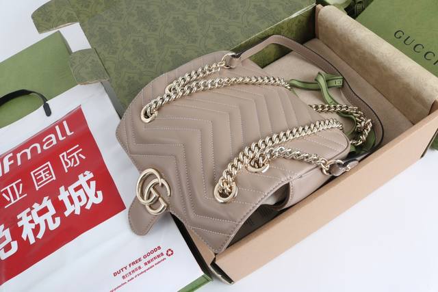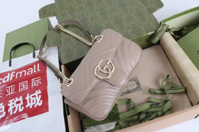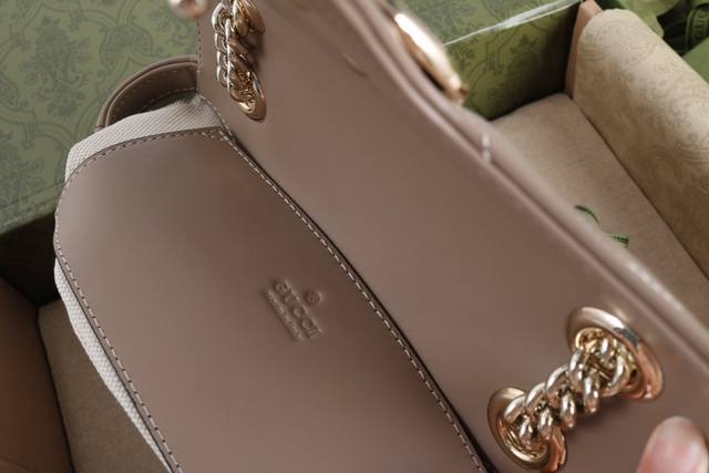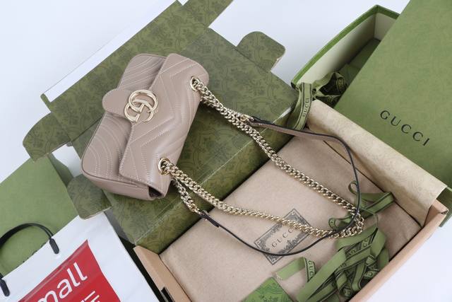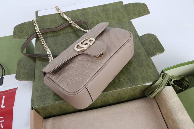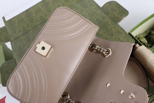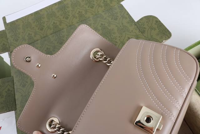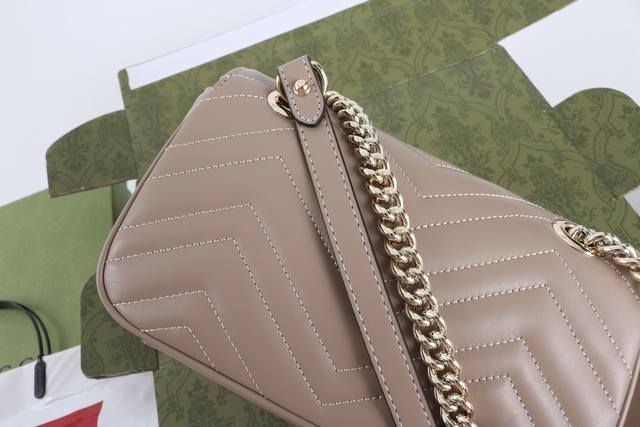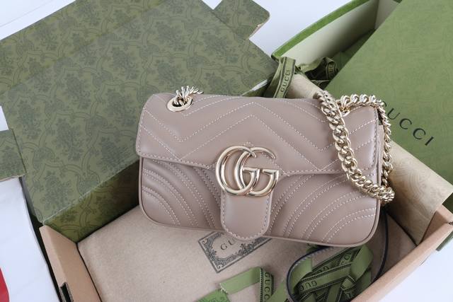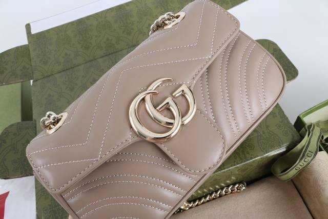 This Gg Marmont handbag is crafted from silver metallic leather. From mirrored leather to sparkling crystals, a variety of dazzling pieces celebrate the gifting season. Choose printed accessories or a glossy leather wallet to add a touch of vibrancy to your look. Model 446744 Beige/Light Gold. Made of high-quality, soft, natural grain cowhide with matching brass hardware. Dimensions: 22 x 13 x 6 cm.