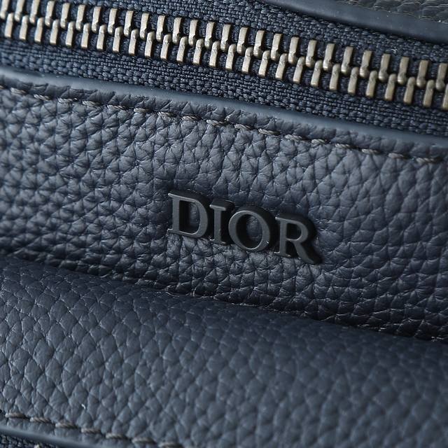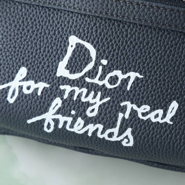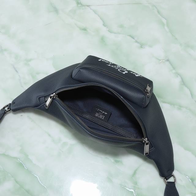 This Rider 2.0 waist bag is from the Dior And Hylton Nel limited edition collection. Crafted from navy blue grained calfskin and other materials, the front zip pocket features a white Dior For My Real Friends logo print from the Dior And Hylton Nel collaboration, adding a touch of sophistication. The zippered main compartment can hold various everyday essentials and features an adjustable strap for crossbody wear. Model: 1Esbo077Fry_H56E Dimensions: 39