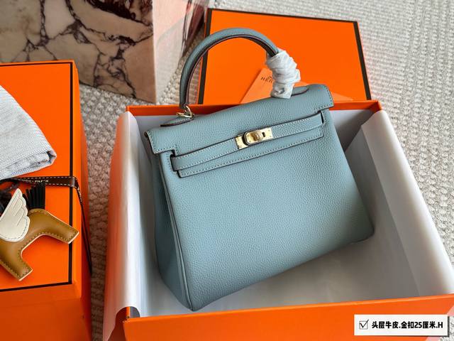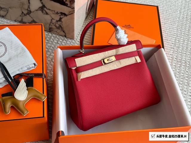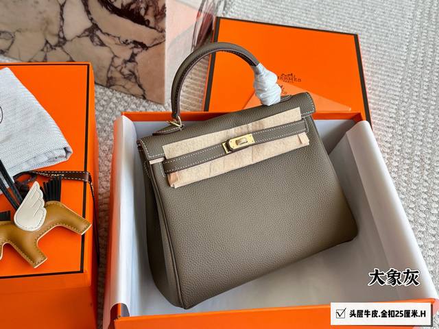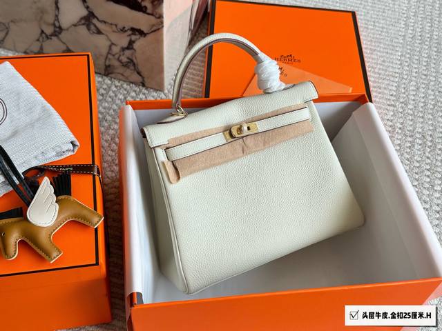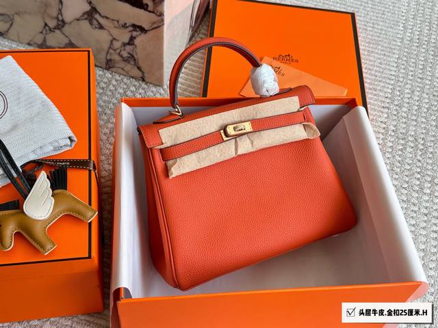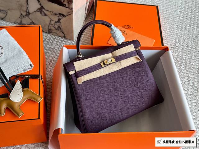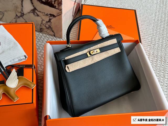 Top-grain cowhide full packaging. Classic and timeless. Hermes Kelly 25. Hermes Kelly 25 top-grain cowhide. The perfect blend of black and gold, not only classic and versatile, but also exuding an understated luxury. Togo leather is soft and delicate, with a relaxed and relaxed feel. Whether shopping, dating, or at work, it easily holds its own and becomes an indispensable fashion accessory. I truly love it. 25cm.