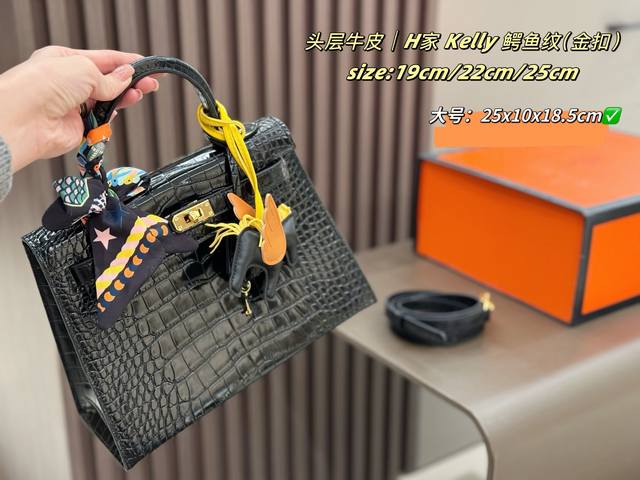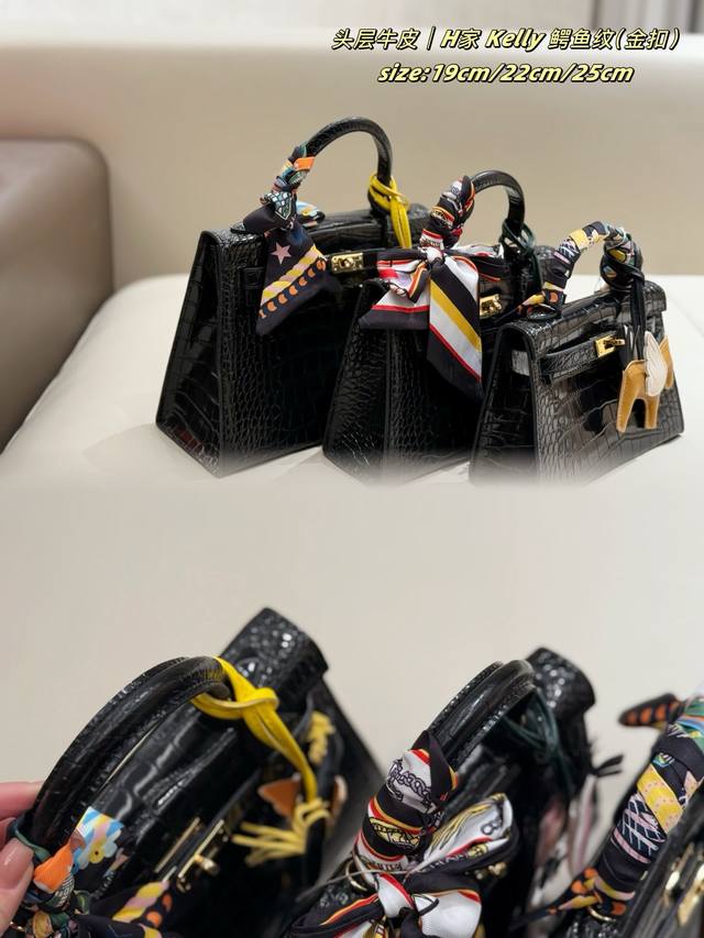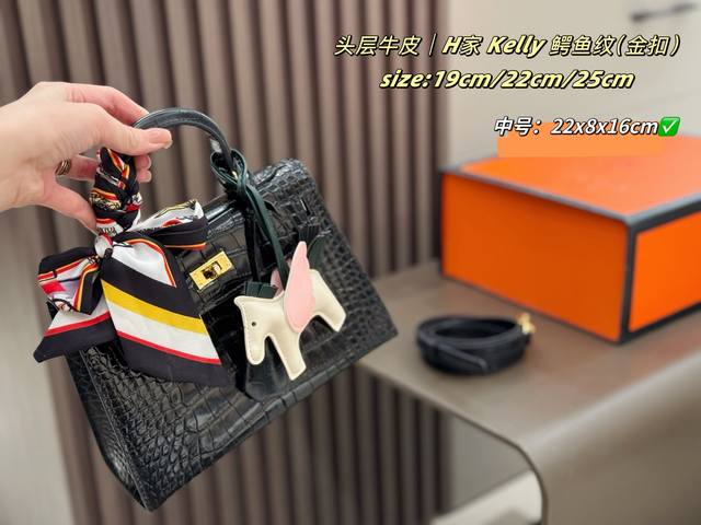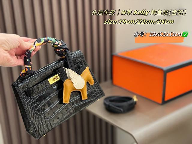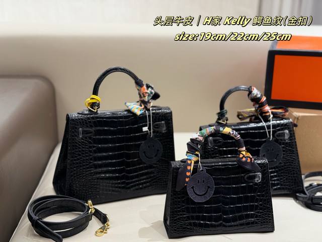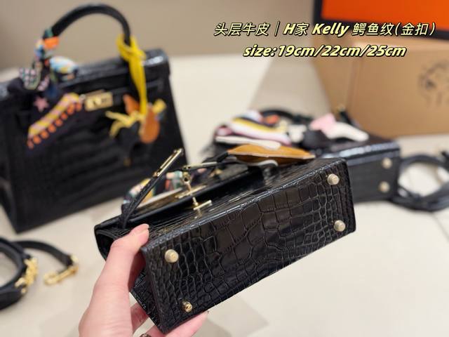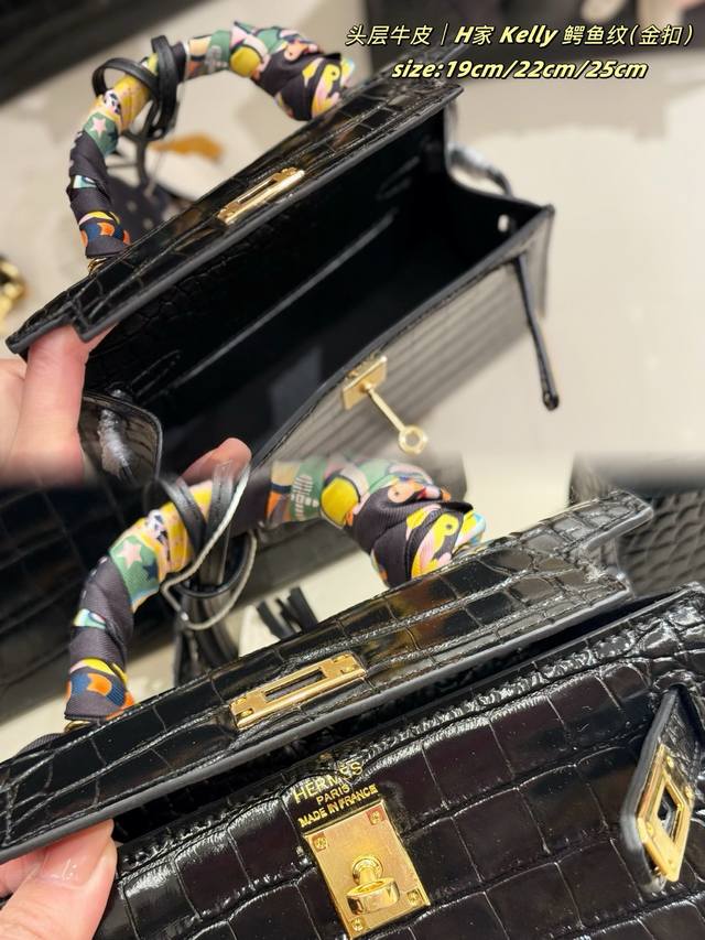 Top-grain cowhide leather, double-box packaging. Hermes Kelly crocodile-embossed design with gold hardware. The crocodile pattern is sophisticated and unique, the color scheme is classic yet stylish. Small and exquisitely crafted, it's sure to turn heads. Size: Small: 19 x 6.5 x 13 cm; Medium: 22 x 8 x 16 cm; Large: 25 x 10 x 18.5 cm.