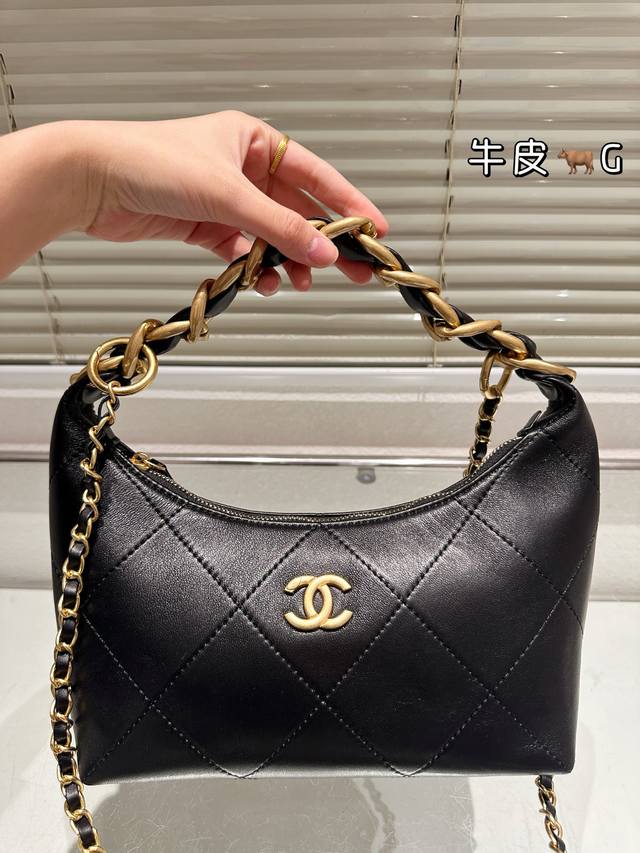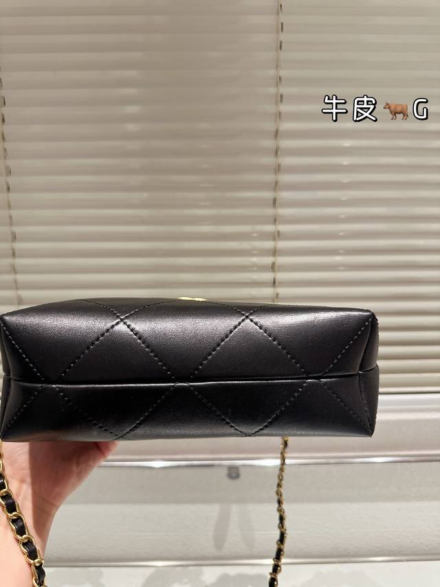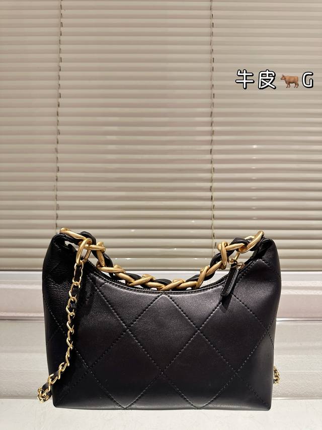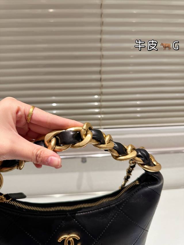 Top-grain leather Chanel 25K Hobo Hippie bag. This Chanel 25K Hobo Hippie bag features black glossy calfskin with a classic large diamond quilting and a gold double C logo for a luxurious feel. The chunky chain handle and distressed hardware give it a retro yet stylish look. It looks great whether carried under the arm or by the hand! Measuring approximately 28 x 17 x 9 cm, it has a moderate capacity, perfect for daily commutes or casual outings. The soft body and metal zipper make it both practical and sophisticated. A hot item from the 2025 Fall/Winter collection, it's being praised by the fashion world! (Dimensions: 23 x 15 cm)