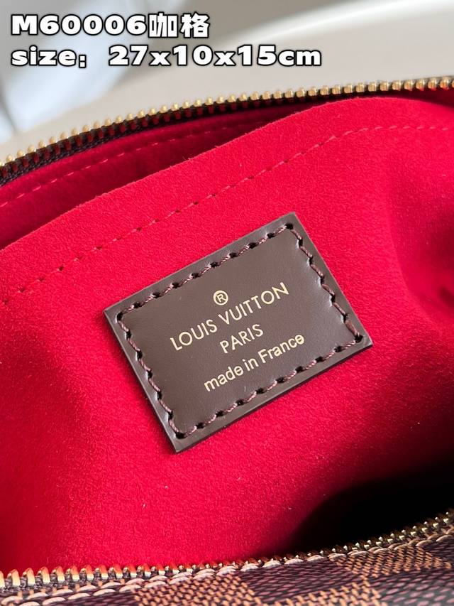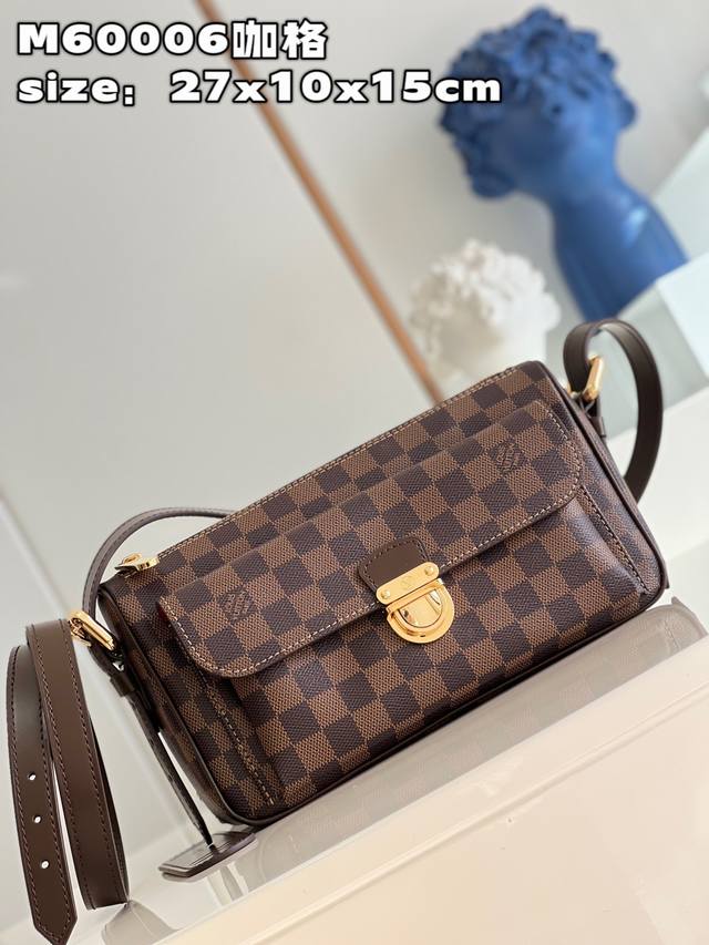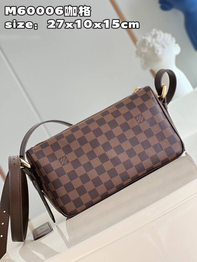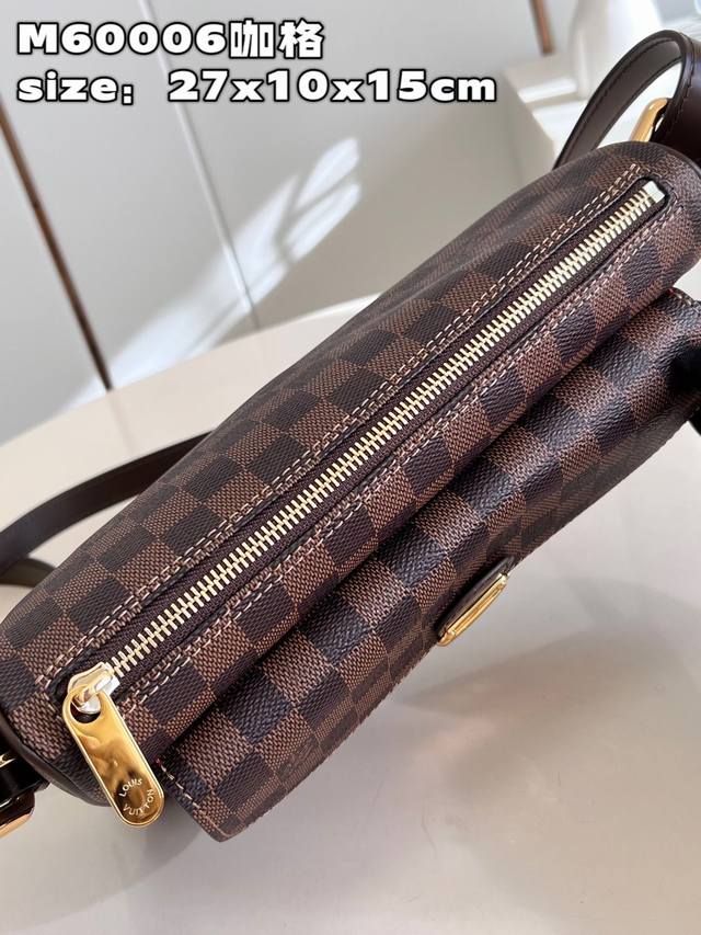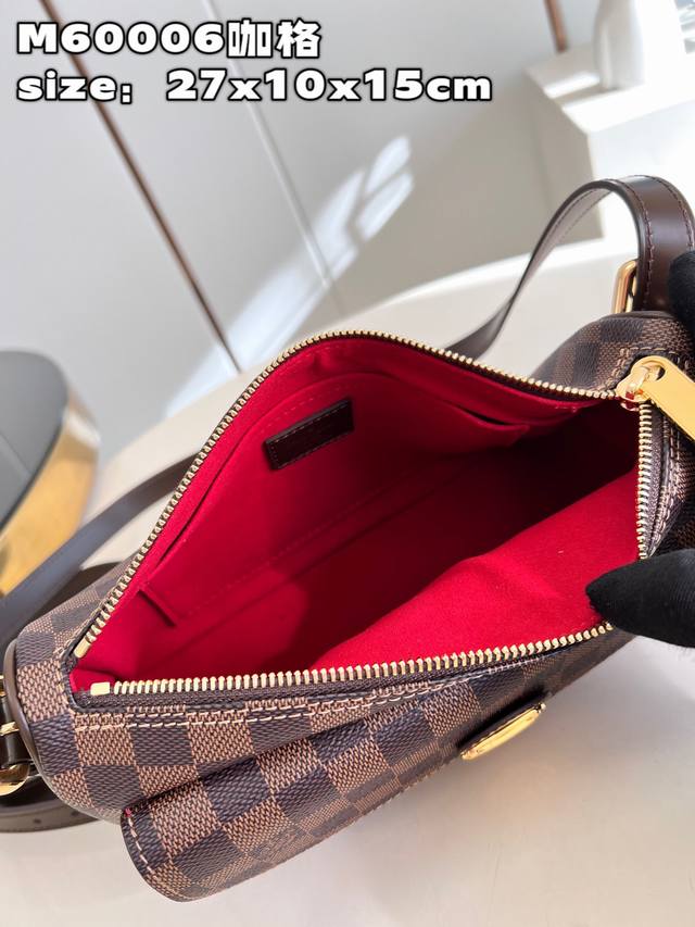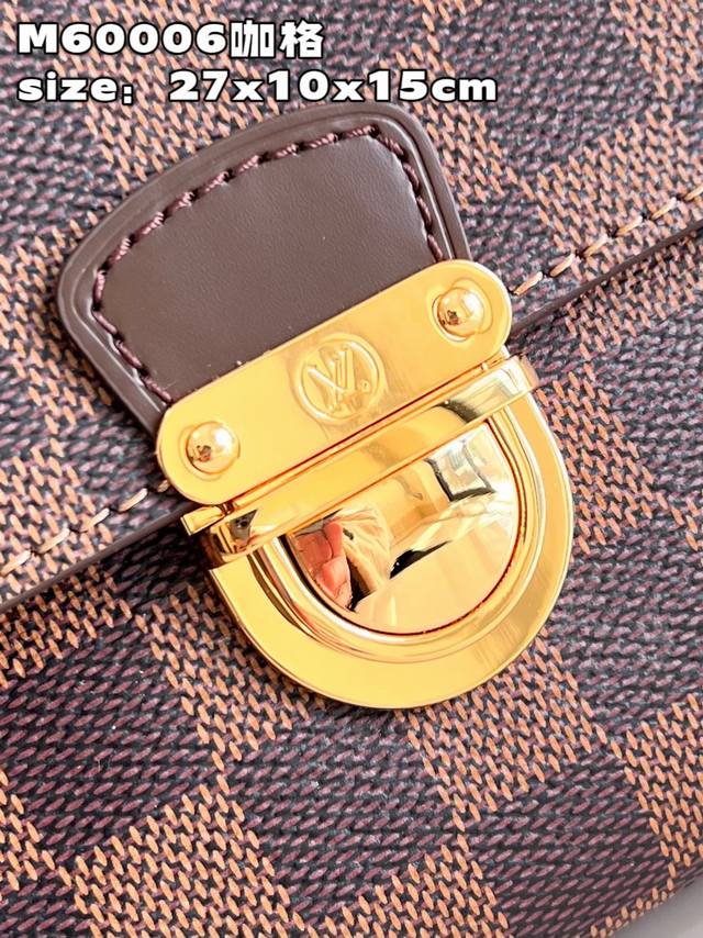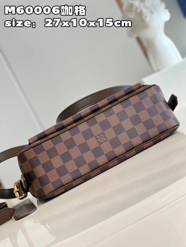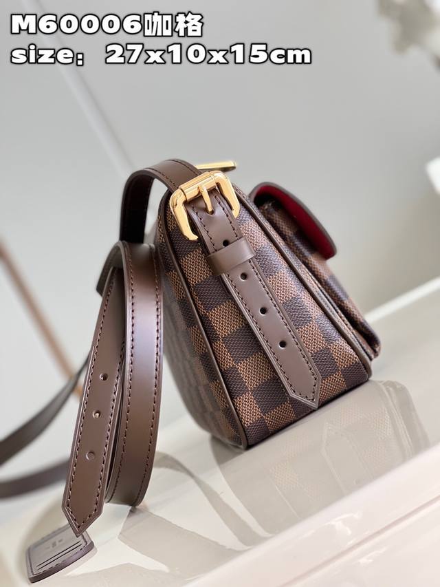 Top-quality original, individual photos of the M60006 vintage brown crossbody bag made of Damier canvas. It features a spacious interior with one flapped exterior pocket. The bag has a Damier canvas body, off-white microfiber lining, smooth leather trim, and bright gold hardware. It has an interior patch pocket, a crotch-style exterior pocket with a flap and push-lock closure, and a padded, adjustable shoulder strap with two straps of different lengths for single-shoulder or crossbody wear. Dimensions: 27*10*15cm (Length*Width*Height).