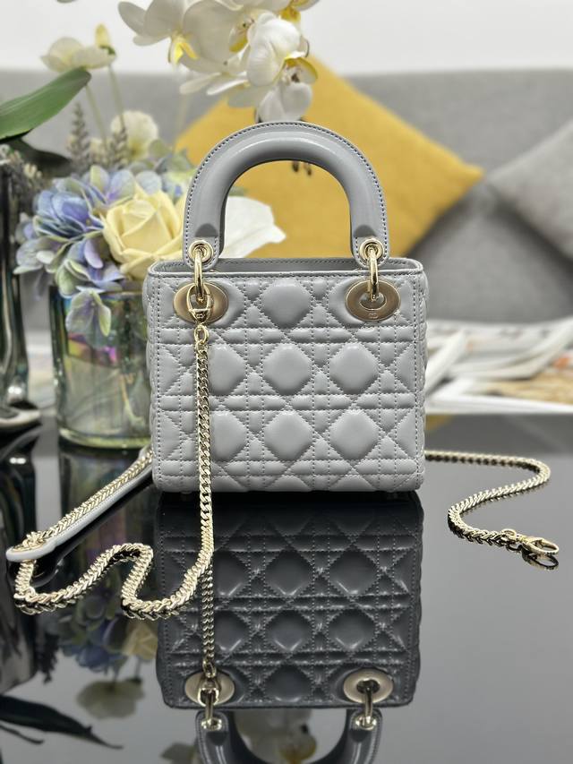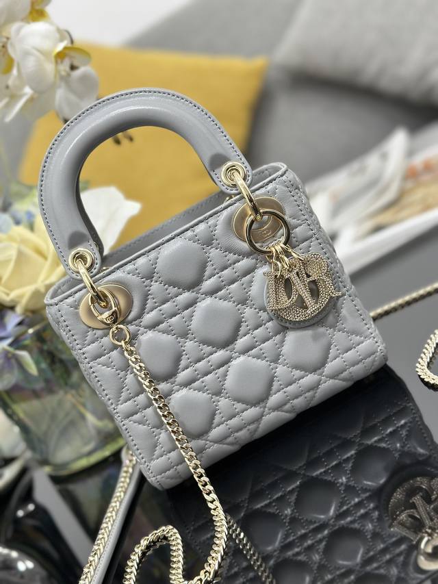 Top-quality original Lady Dior three-compartment diamond-buckled lambskin leather, with lambskin lining. Crafted from meticulously crafted lambskin leather, the entire piece is adorned with a striking quilted texture created by cannage stitching. Its timeless and elegant design is complemented by a DIOR charm embellished with imitation crystals, adding a touch of dynamism to its exquisite silhouette. This mini style features a detachable chain shoulder strap, allowing for hand-carrying or crossbody wear, making it the perfect companion for evening attire. Dimensions: 17 x 15 x 7 cm, Model M0505. Exclusive real-object photography, comes with brand new gift box.