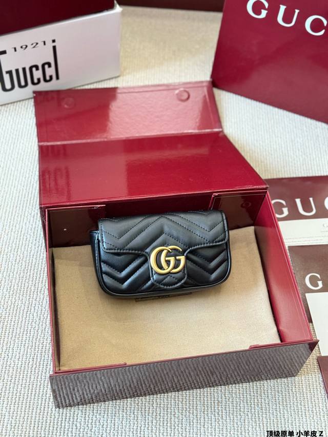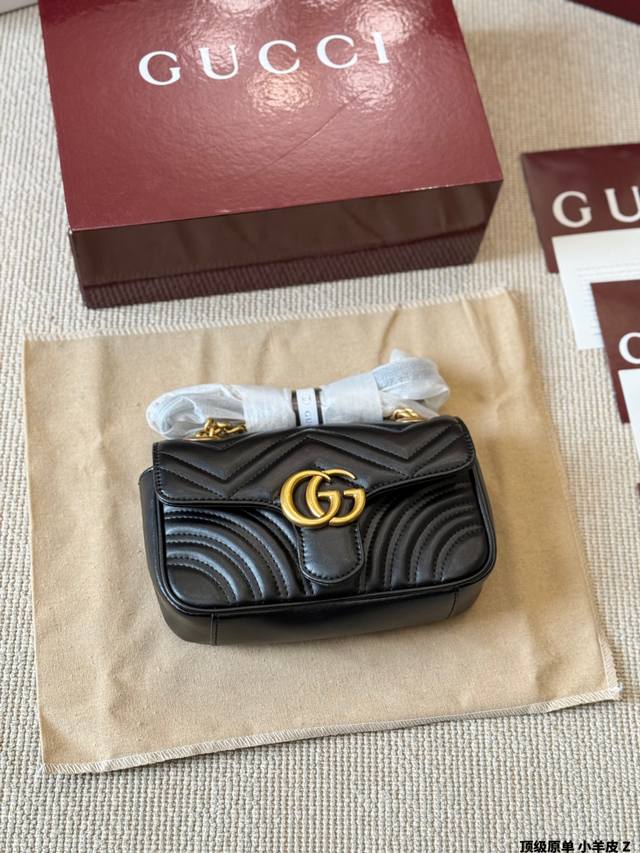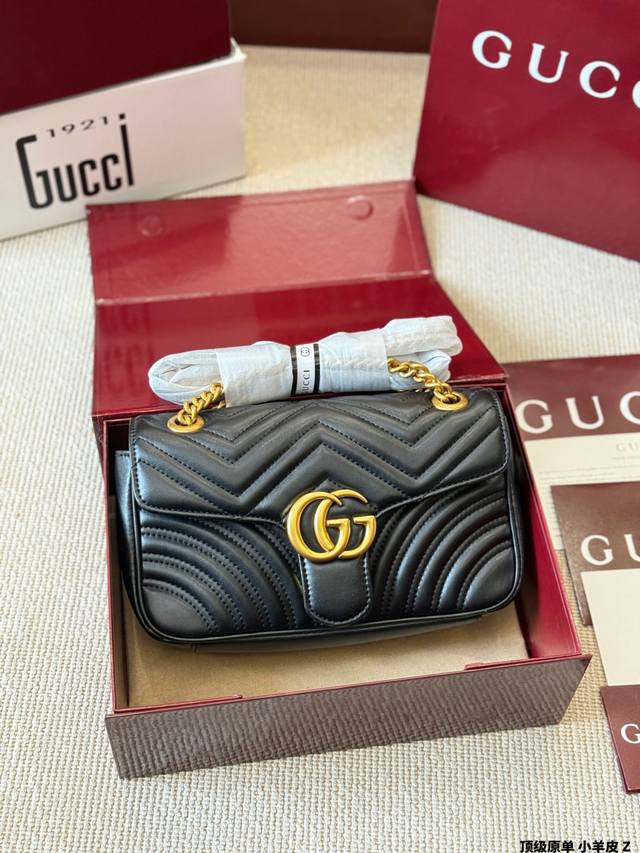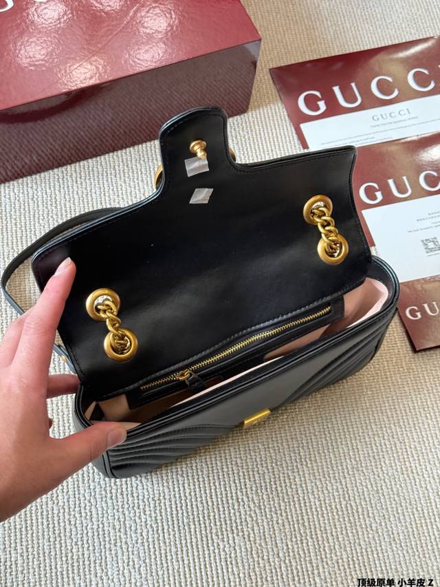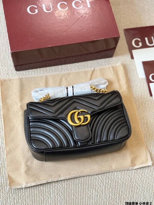 Top-quality original single-piece lambskin Gucci Marmont chain bag. Quilted calfskin with vintage gold double G logo, elegant and classic. Moderate capacity, can hold a phone and cosmetics. The chain shoulder strap can be worn over the shoulder or crossbody, versatile and flattering! Durable, black color doesn't easily show dirt, suitable for both work and leisure. High resale value, a classic style worth buying, practical and collectible. It's recommended to use an inner bag to prevent deformation! Dimensions: 26cm, 22cm, 16cm.