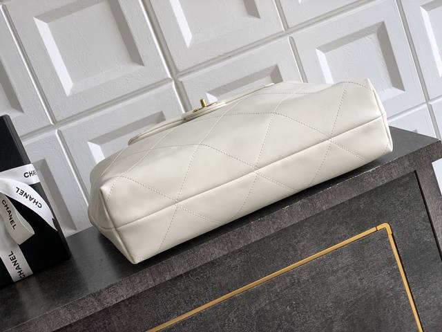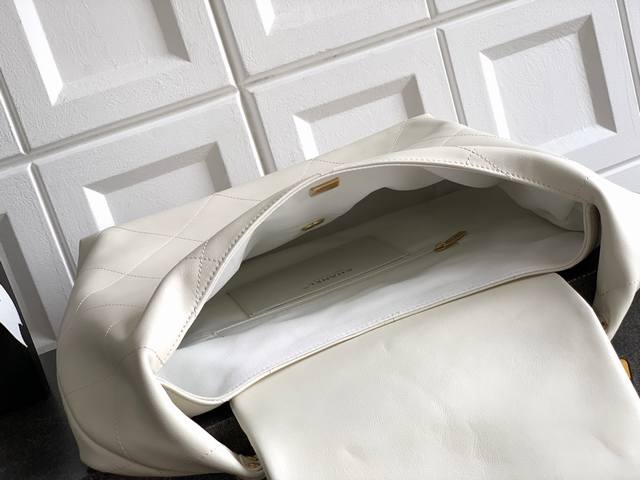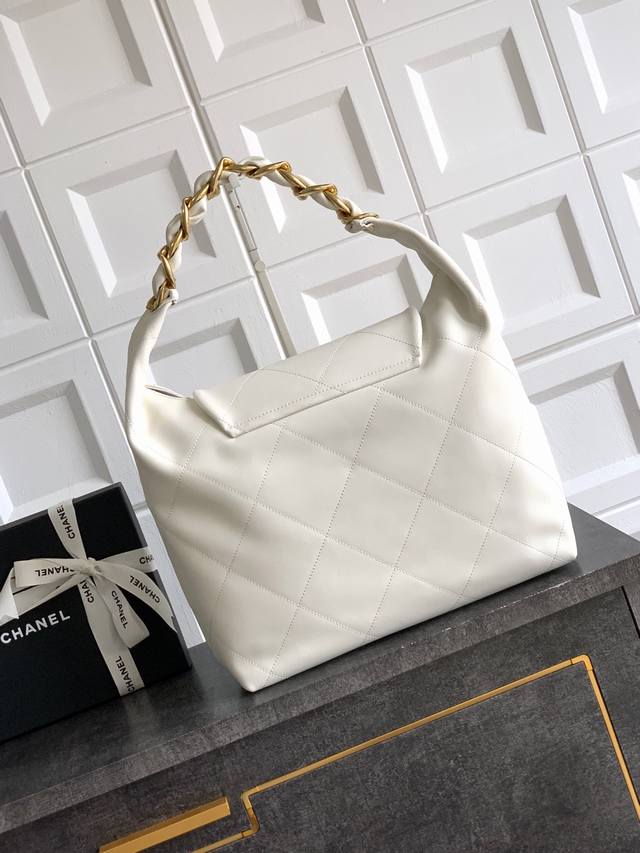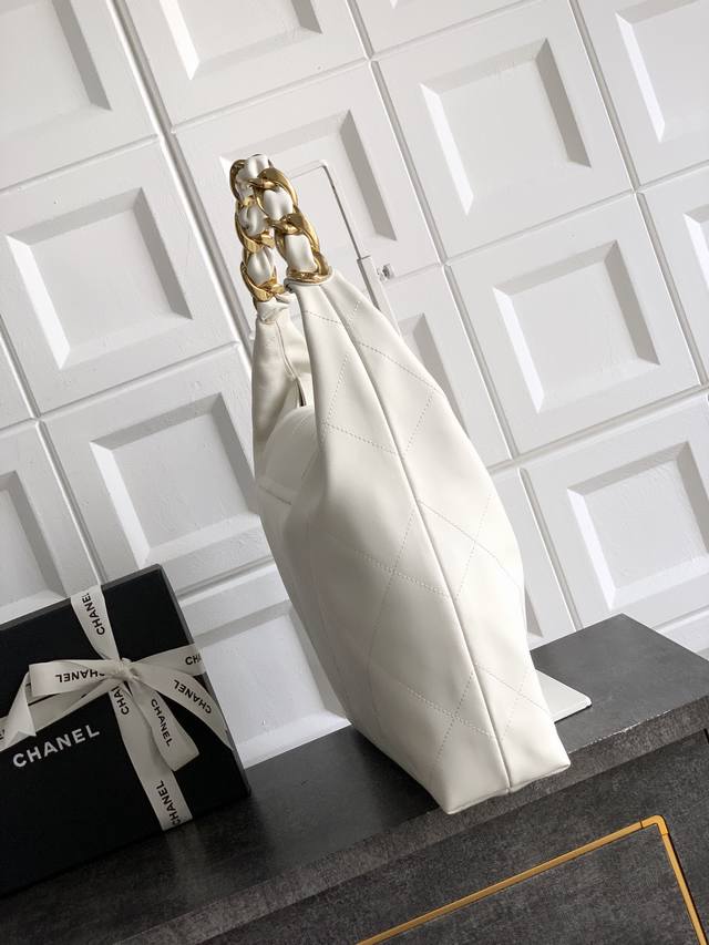 Top-quality original small size: 35 X47 X9Cm Ohanel 25K hippie Hobo bag! A Fall/Winter runway Hobo Maxi bag exuding confidence and unisex style. The glossy calfskin is "delicate and soft," the Hobo shape is "laid-back," and the chunky chain adds a "cool" touch. Effortlessly stylish, it's perfect for both work commutes and casual outings. The double C clasp subtly shines, and the spacious interior is perfect for commuting and can even hold an iPad! Size: 35 X47 X9Cm