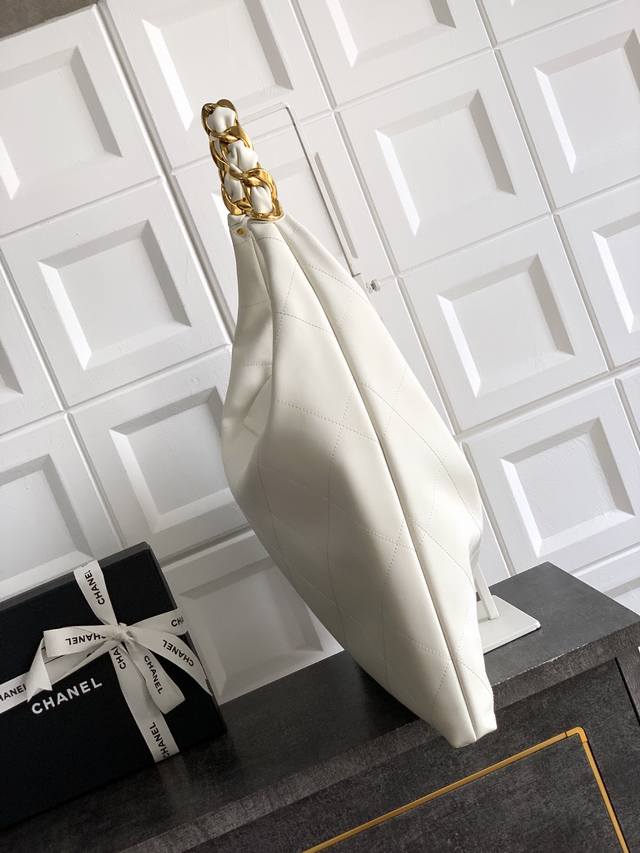 Top-quality original white Ohanel 25K oversized hippie Hobo bag! A Fall/Winter runway Hobo Maxi bag exuding confidence and unisex style. The glossy calfskin is "delicate and soft," the Hobo shape is "laid-back," and the chunky chain adds a "cool" touch. Effortlessly stylish, it's perfect for both work and casual outings. The double C clasp subtly shines, and the spacious interior is perfect for commuting and can even hold an iPad! Dimensions: 43X53X9Cm