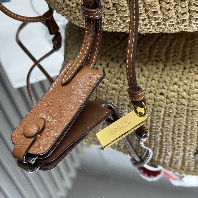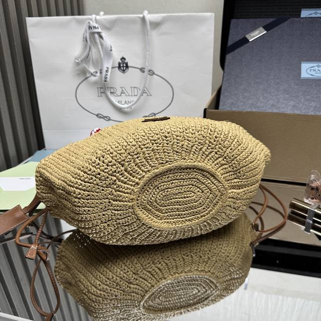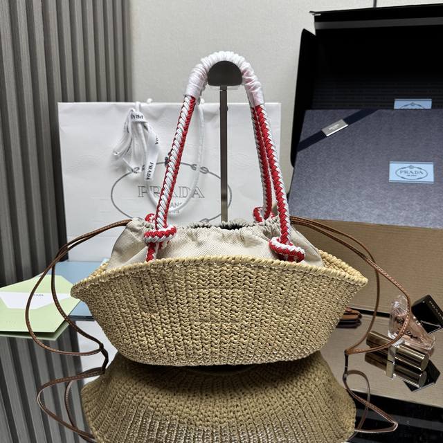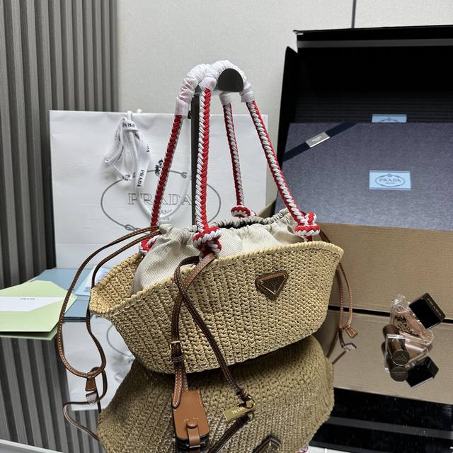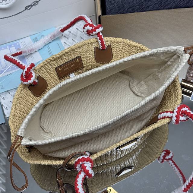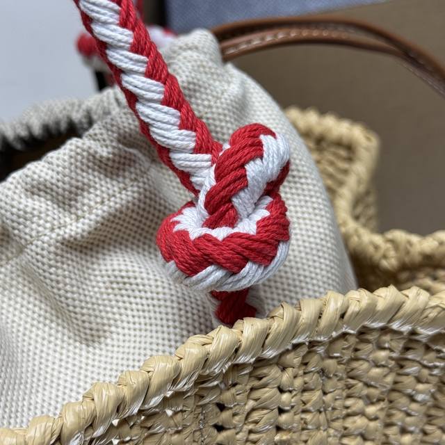 Top-tier original 1Ba463 New Woven Basket Arrives! This handmade crocheted bag exudes a free and retro charm. The exquisite crocheting craftsmanship speaks of superb skill and attention to detail. Features include a cotton rope handle, a detachable leather pendant, metal hardware, an enamel metal triangle logo on the front, a removable pouch inside, and a drawstring. Dimensions: 26