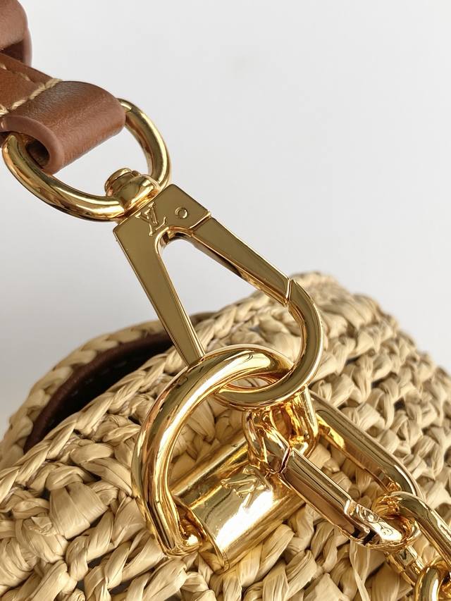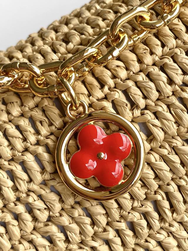 This Twist Slim handbag embodies the relaxed style of the French Riviera, showcasing the brand's exquisite craftsmanship with creative touches. The raffia body incorporates contrasting leather trim and the iconic LV Twist lock, multiple pockets for organized storage, and a detachable mirror adds to its functionality.