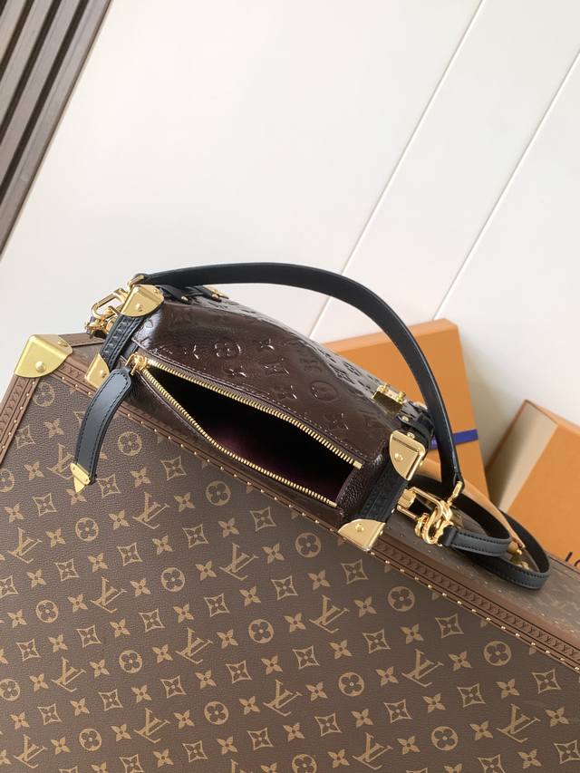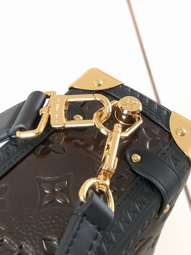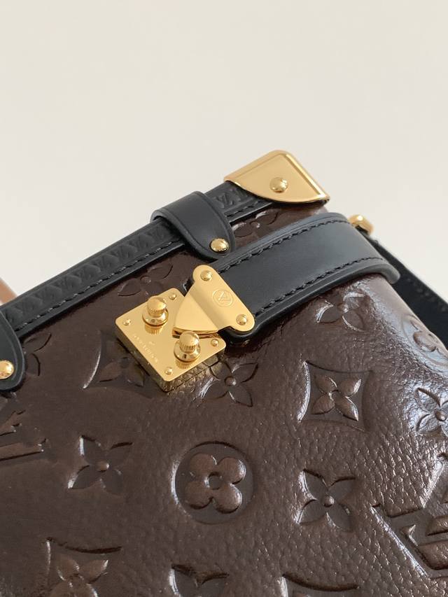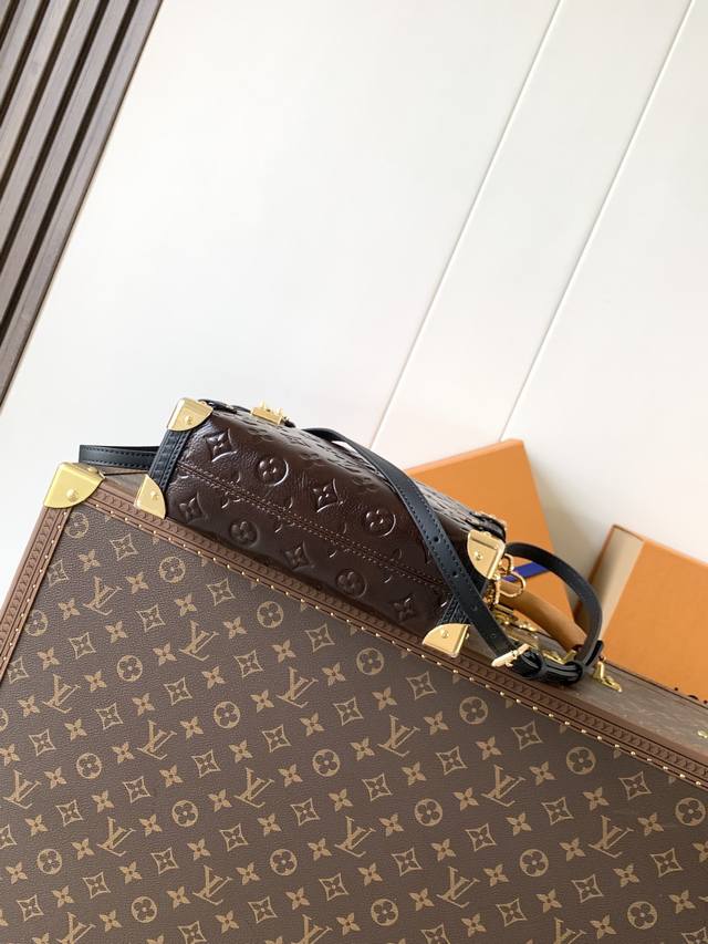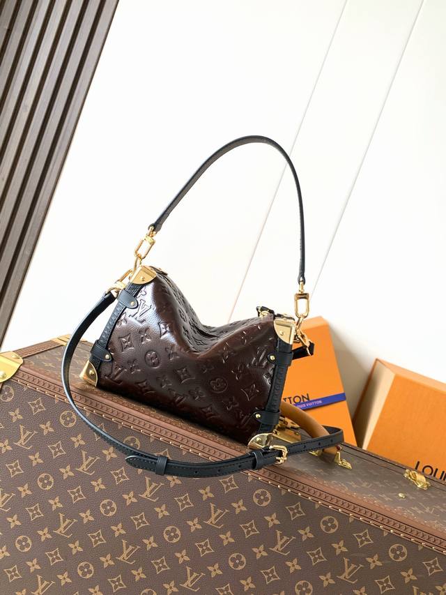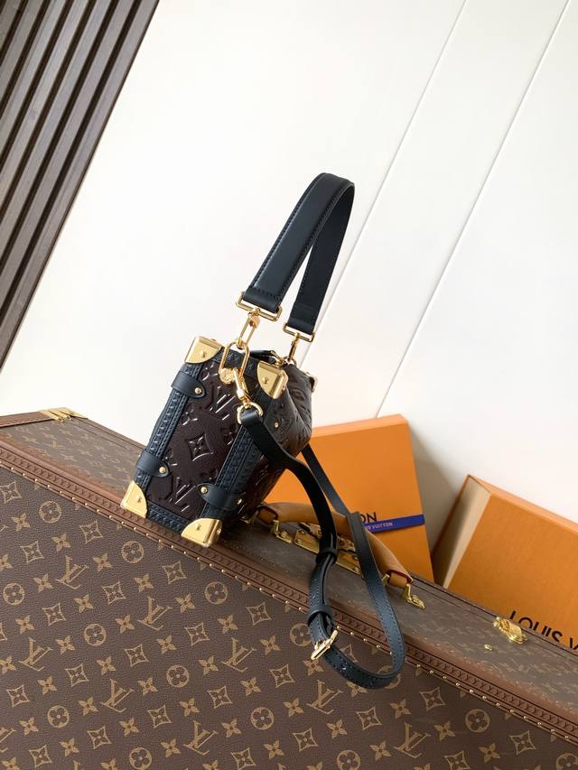 M25160 Black, M25072 Grey, M24309 Matte Black Button. The Louis Vuitton Fall/Winter 2025 collection continues the brand's trunk-making tradition. This medium-sized Side Trunk bag is crafted from iconic Monogram Saga leather, its vintage feel inspired by the classic trench coat worn by supermodel Freja Beha Erichsen in Nicolas Ghesqui