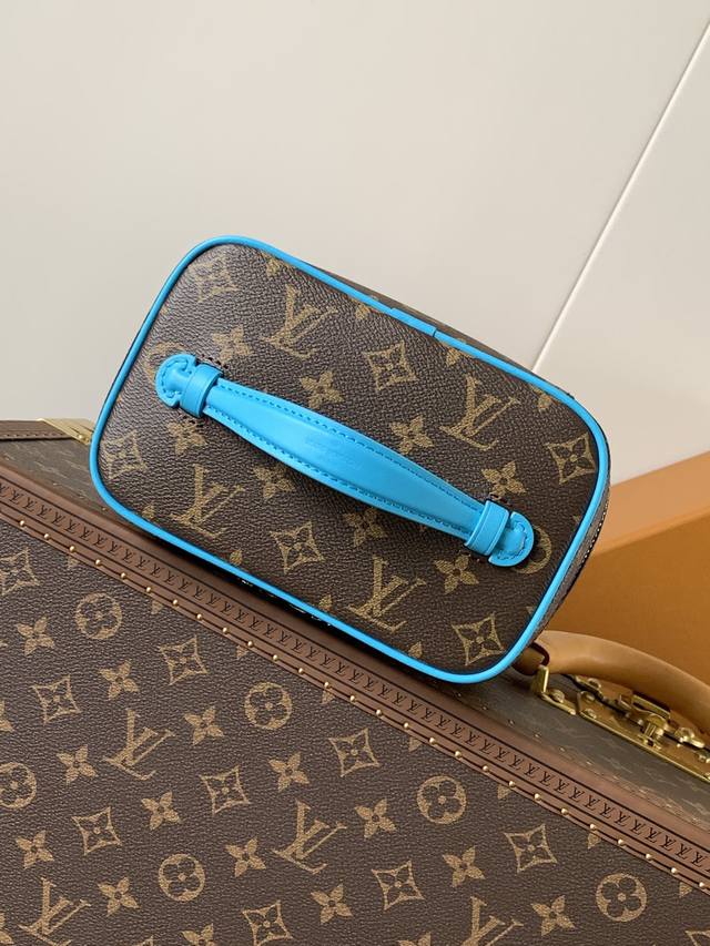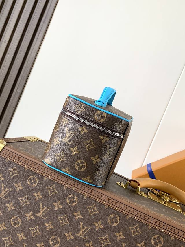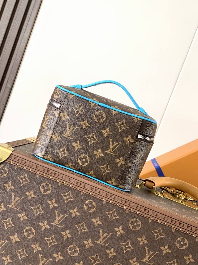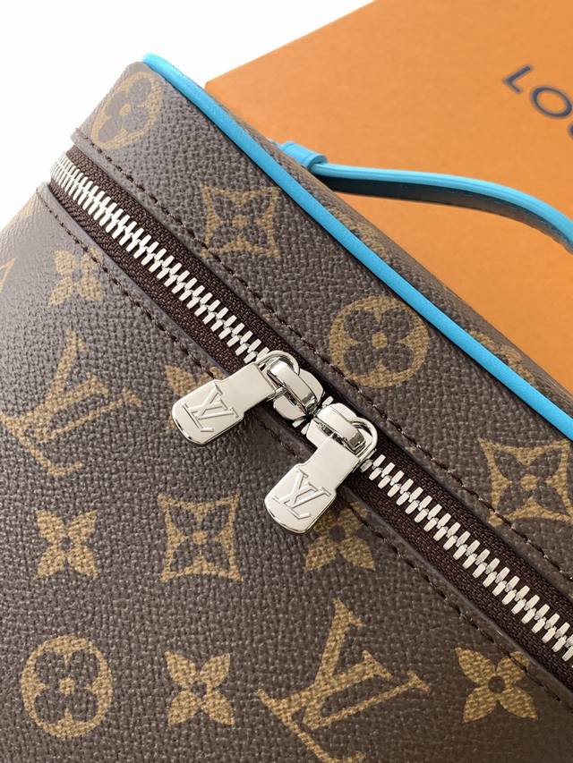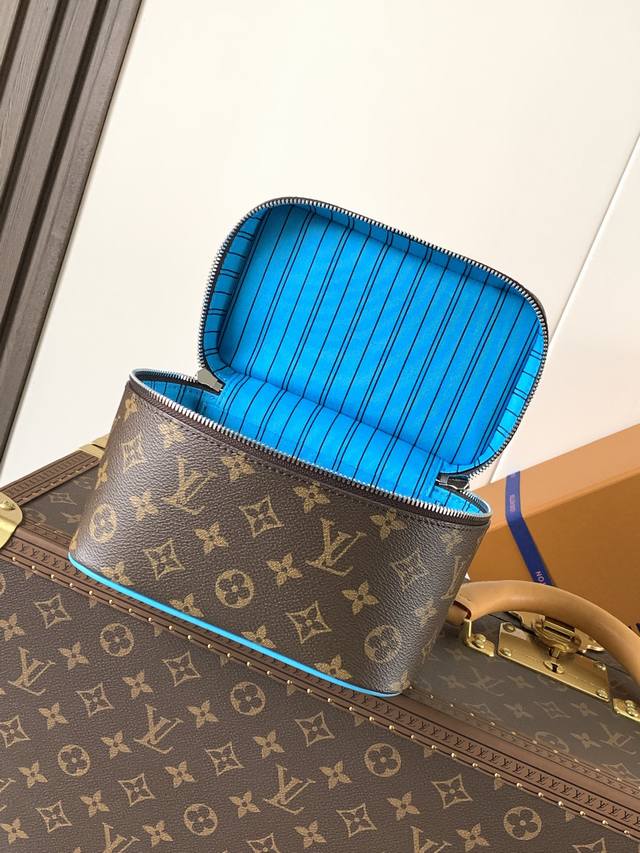 Top-tier original, with variable serial number chip. This Nice mini cosmetic bag features a compact design crafted from Monogram Macassar coated canvas, easily fitting into a travel bag. Bright colors are achieved through top trim, leather handles, and a washable lining, while the interior striped pattern subtly echoes classic designs from the brand's archives. Dimensions: 13.5 x 12 x 20 cm (H x W x Length). Materials: Monogram Macassar coated canvas, cowhide leather trim, fabric lining, metal hardware, double zipper closure, interior slip pocket, single handle.
