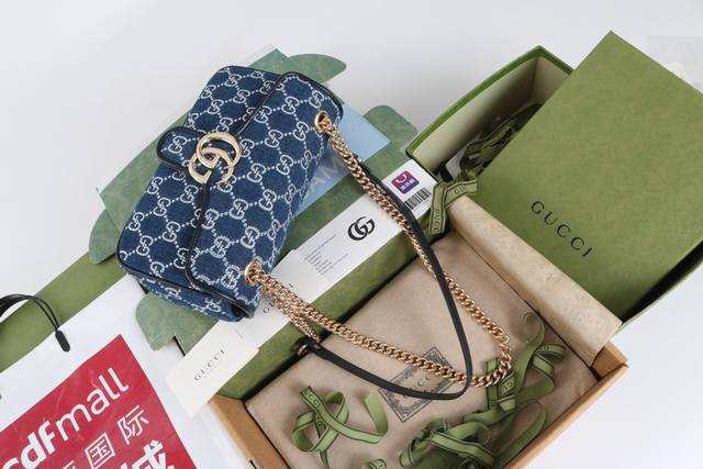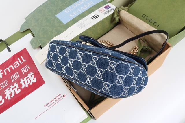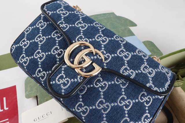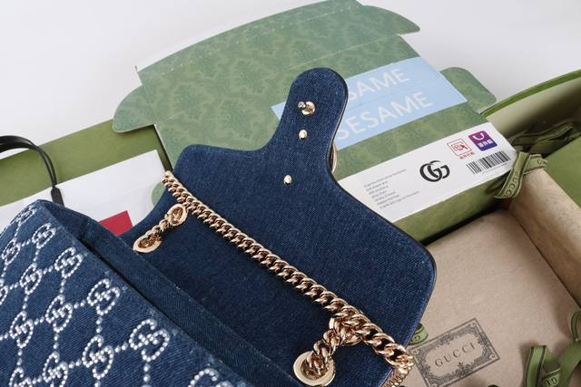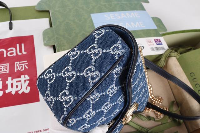 Upgraded Version with Rhinestones - Denim Bag Description: This piece is from the Lido collection, inspired by the summer vibes and beach clubs of the Italian coast. The bag's exquisite craftsmanship recreates a captivating moment under the bright moonlight. Crafted from premium blue Gg denim, it features delicately crafted light gold hardware. Red and blue striped webbing runs through leather loops on both sides and attaches to the hardware loops. Model 443497. Material: High-quality denim embossing, paired with imported cowhide leather, and matching premium brass hardware chain. Dimensions: 26 x 15 x 7 cm.