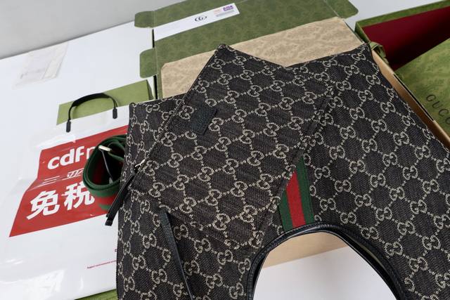 . Material: Authentic denim fabric with top-grain cowhide leather, leather piping, and red and green webbing details lining.