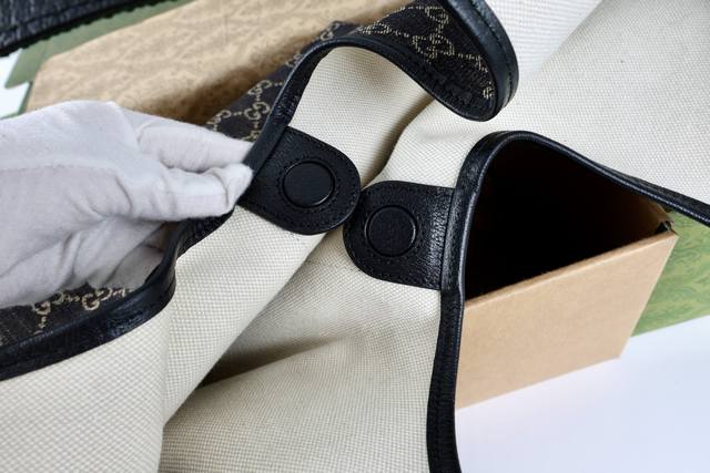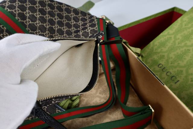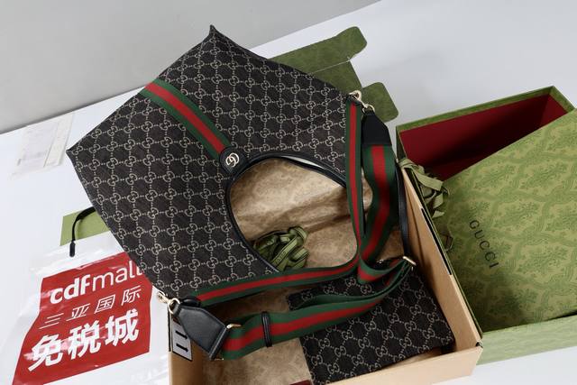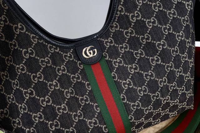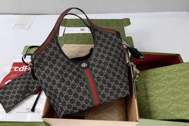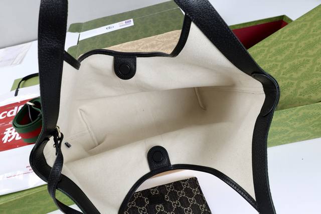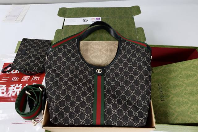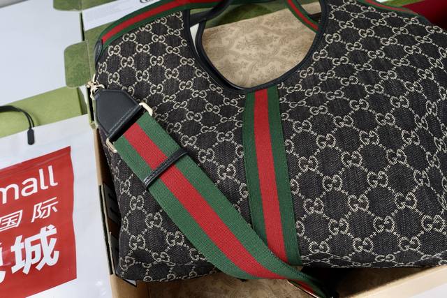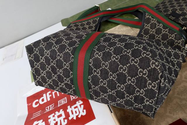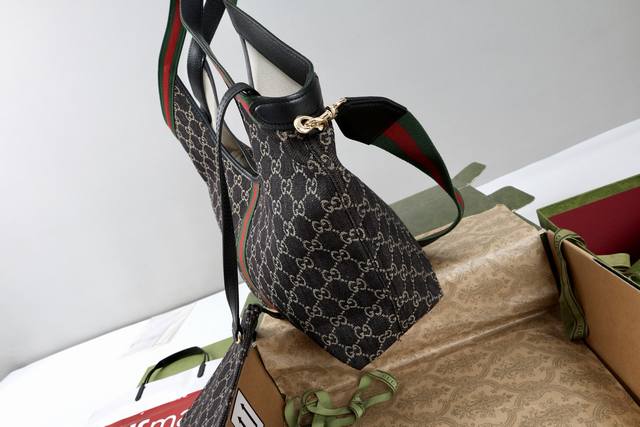 with shoulder strap. Description: The canvas pays homage to the brand's instantly recognizable interwoven Gg pattern, derived from the initials of the brand's founder. This everyday tote bag features red and green webbing details and a dark brown leather shoulder strap, making it an ideal choice.