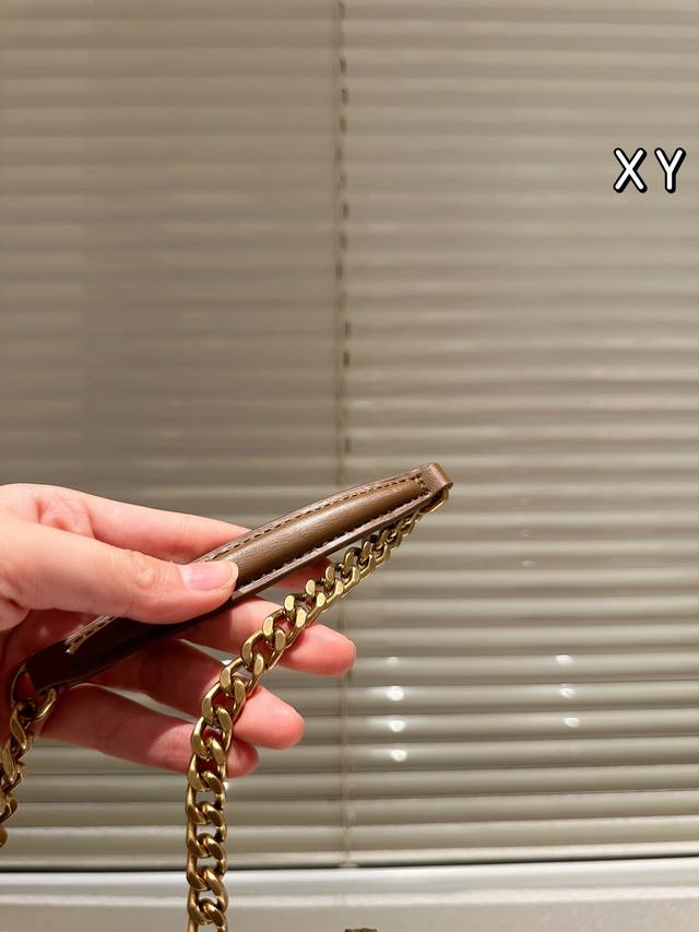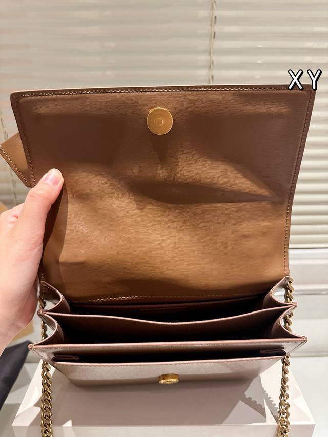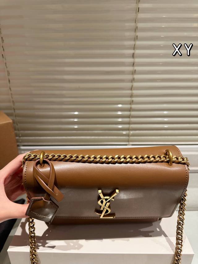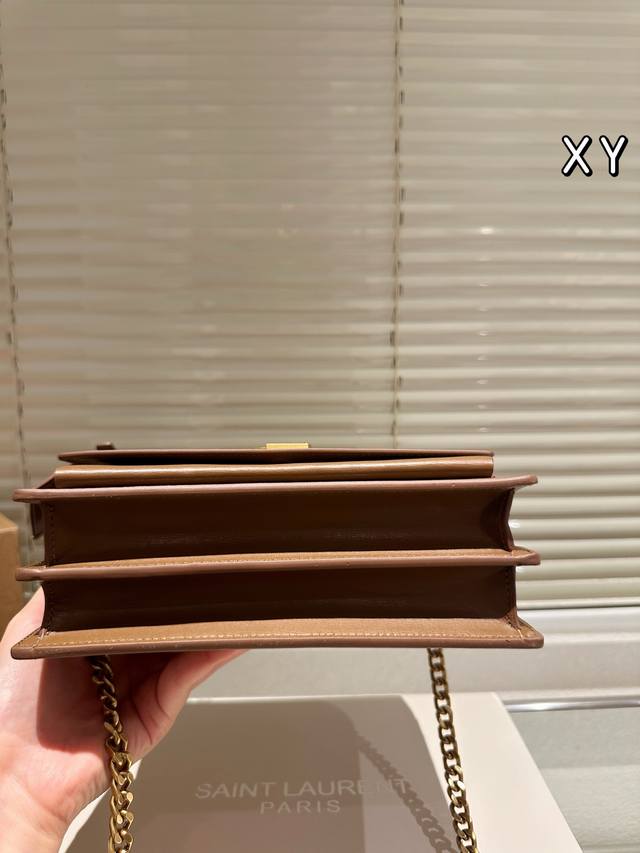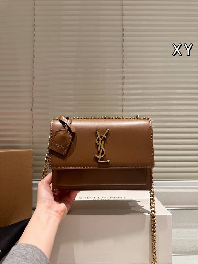 ) The YSL Sunset bag is a medium-sized calfskin bag with a gold logo, simple yet sophisticated. Measuring 25