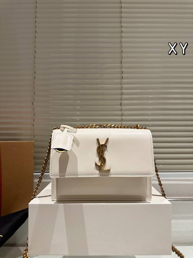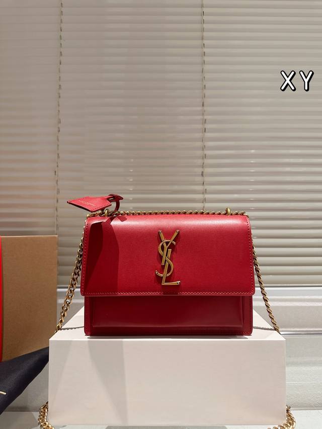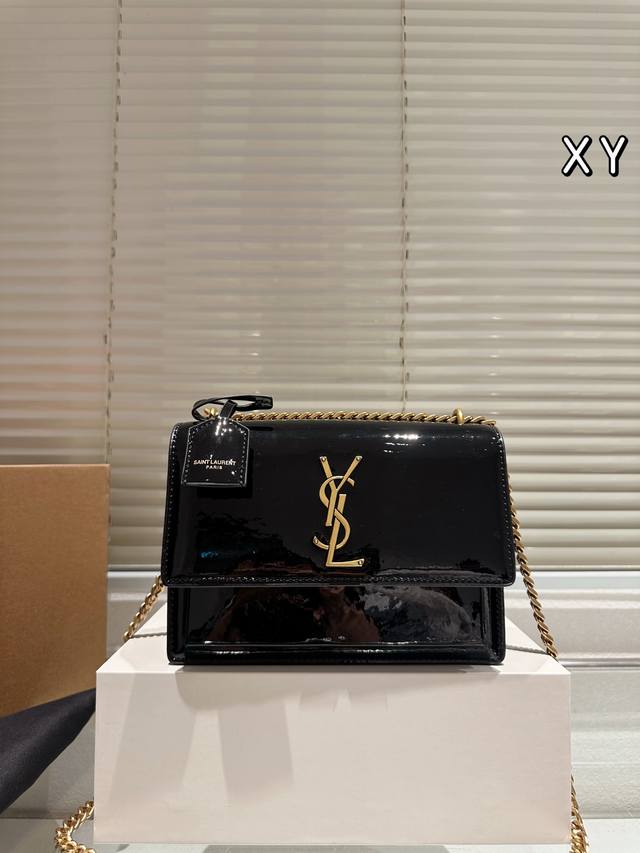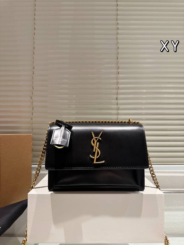 ) The YSL Sunset bag, medium size, is made of calfskin with a gold logo, simple yet sophisticated. Measuring 25