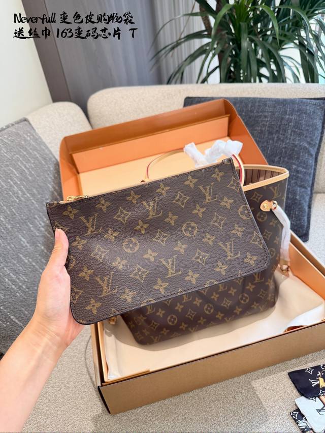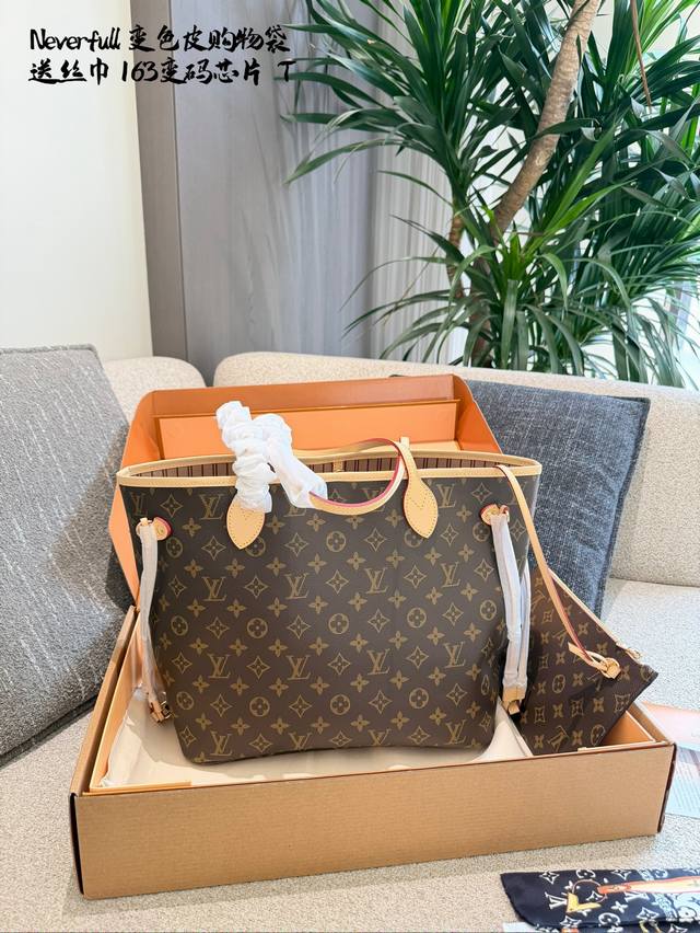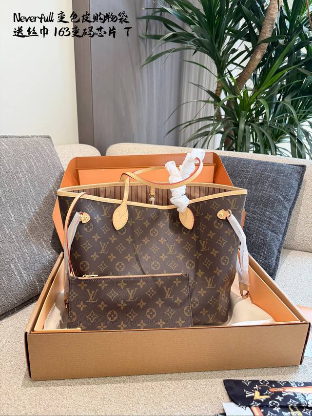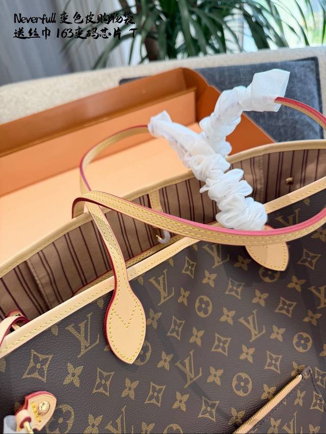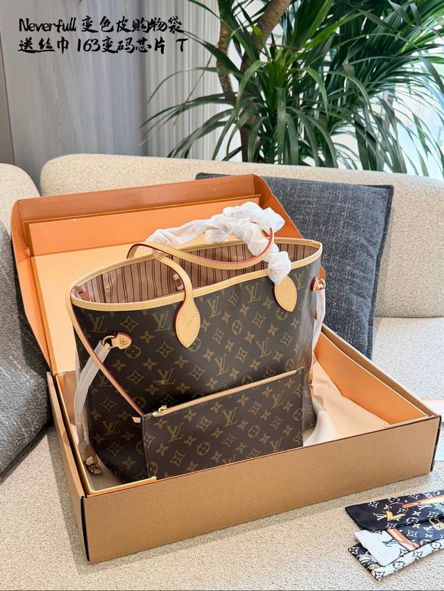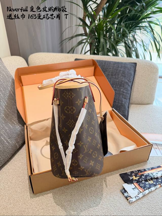 Lv Neverfull Medium Shopping Bag! An entry-level style! Absolutely a lifetime classic! Its classic status speaks for itself! A fantastic choice for both street style and practicality! Once you receive it, you can feel the distinct gaps between the leather grains, the even width, and the perfect balance of softness and firmness to the touch. It's color-changing leather! Size: 32 * 28 cm. Comes with two boxes and a silk scarf.
