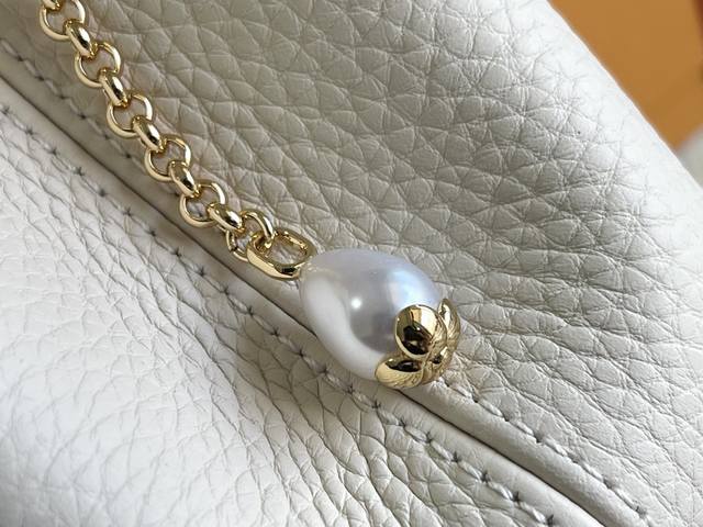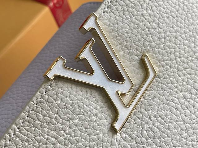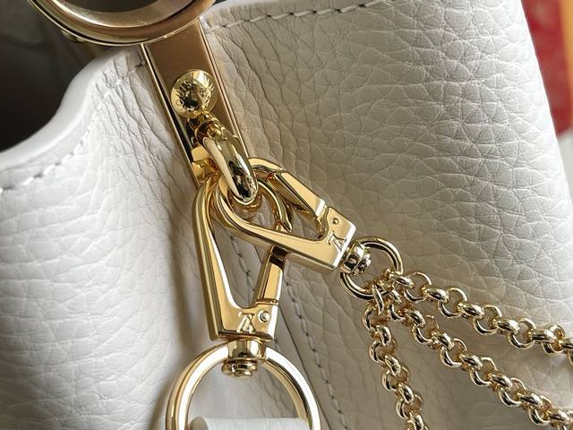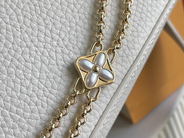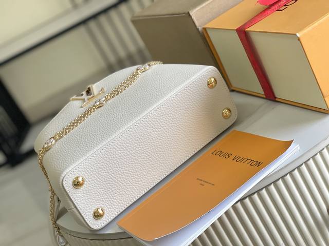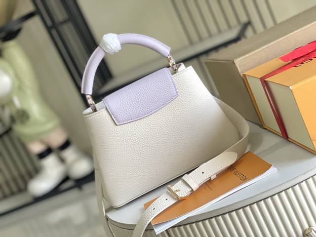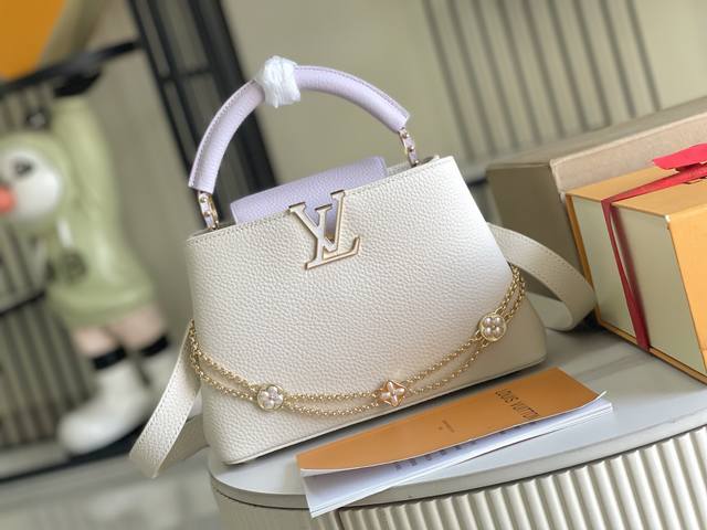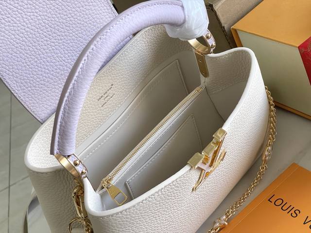 163 Premium Chip with Full Packaging, Top-Grade Original Leather M25461 Off-White with Taro Purple, Small Upgraded Hardware Ddd This Capucines handbag is crafted from Taurillon leather, featuring an enamel Monogram floral cluster and dazzling chain links. Each flower is hand-polished and enamelized, showcasing the brand's exquisite craftsmanship. Dimensions: 27 x 18 x 9 cm DDD
