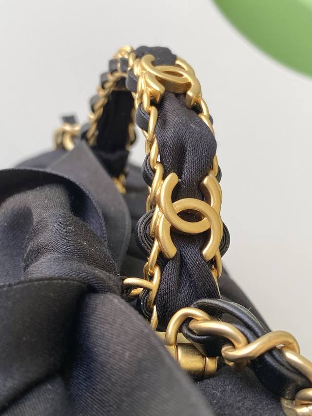 25K Series Velvet Bow Handle Bag, made of black velvet material with a delicate touch and a luxurious matte finish. Classic quilted pattern with a gold double C clasp, adorned with a ribbon bow, exuding elegance and sweetness! The leather-threaded chain handle allows for hand-carrying or shoulder-carrying, easily paired with autumn/winter coats and dresses, radiating a retro French vibe. While small in size, it's perfect for everyday wear, a practical and beautiful fashion item. Style number As5875. Size 13-20-6. Comes with packaging.