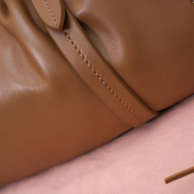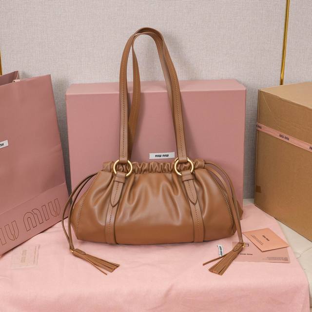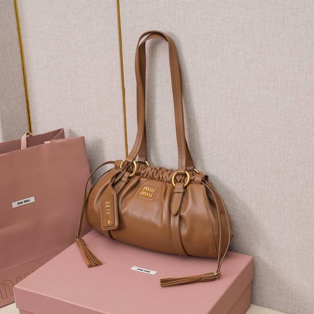 5Bg306 A genuine Miu vintage shoulder bag with a slanted, oiled edge. Made of brand new, soft lambskin, exuding a retro and nostalgic charm. Features distressed steel hardware for a high-end and elegant feel. The drawstring closure with delicate, playful pleats adds a touch of sophistication while maintaining a relaxed, casual vibe. The interior is lined with a new striped canvas lining and includes a zippered compartment. A unique design that will look good on anyone. Dimensions: 32 x 16 x 10.5 cm.