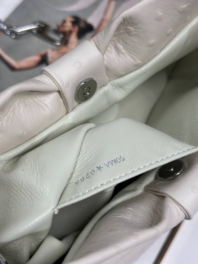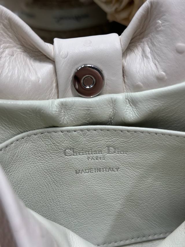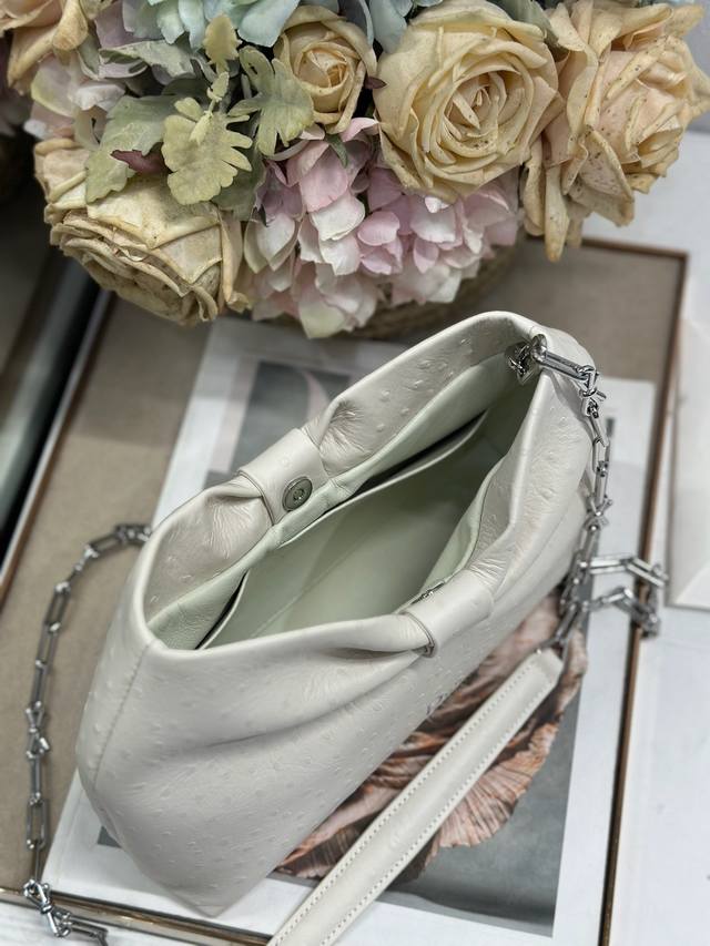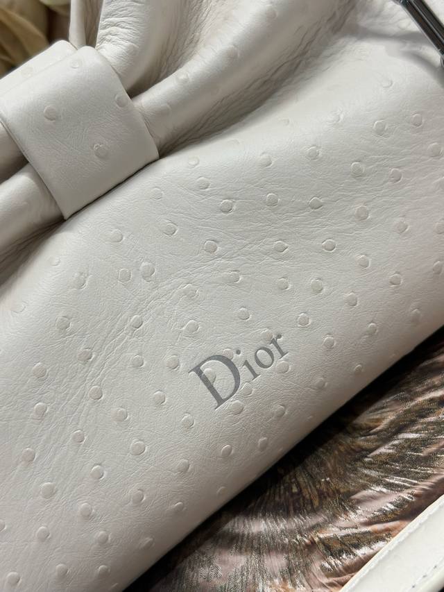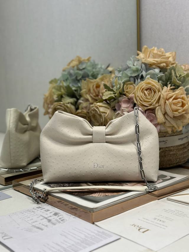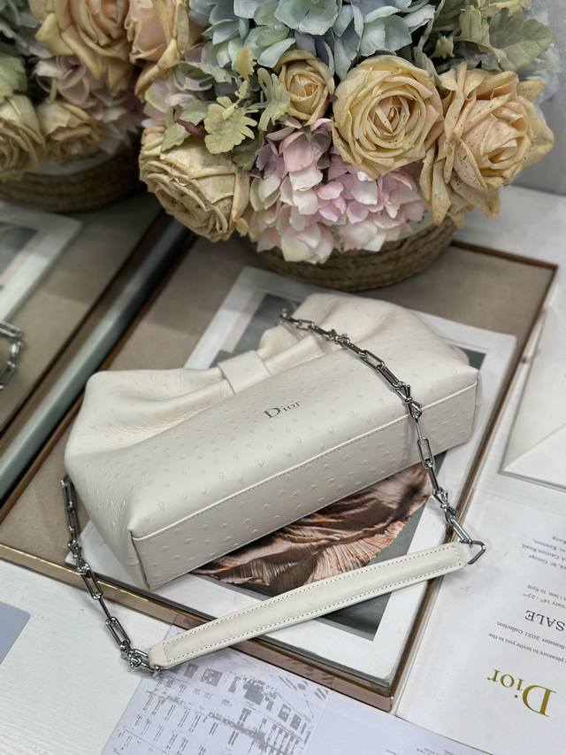 Authentic, High-Quality Dior-Lambskin 2026 Spring/Summer New Ostrich White Handbag with Silver Chain. A brand new bag shape, made of calfskin leather, elegant and sophisticated, practical in style, capable of holding various everyday items, making it an ideal companion for both day and evening wear. The detachable chain is adorned with a butterfly knot for added refinement. It can be carried by hand or worn crossbody. Model: 0714. Dimensions: 27