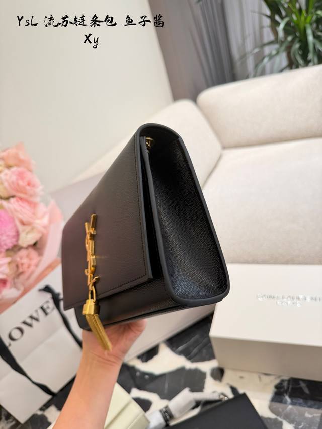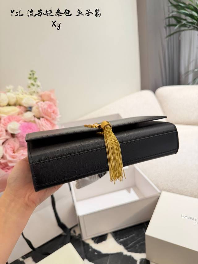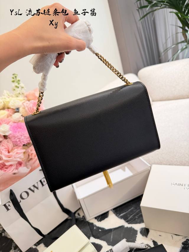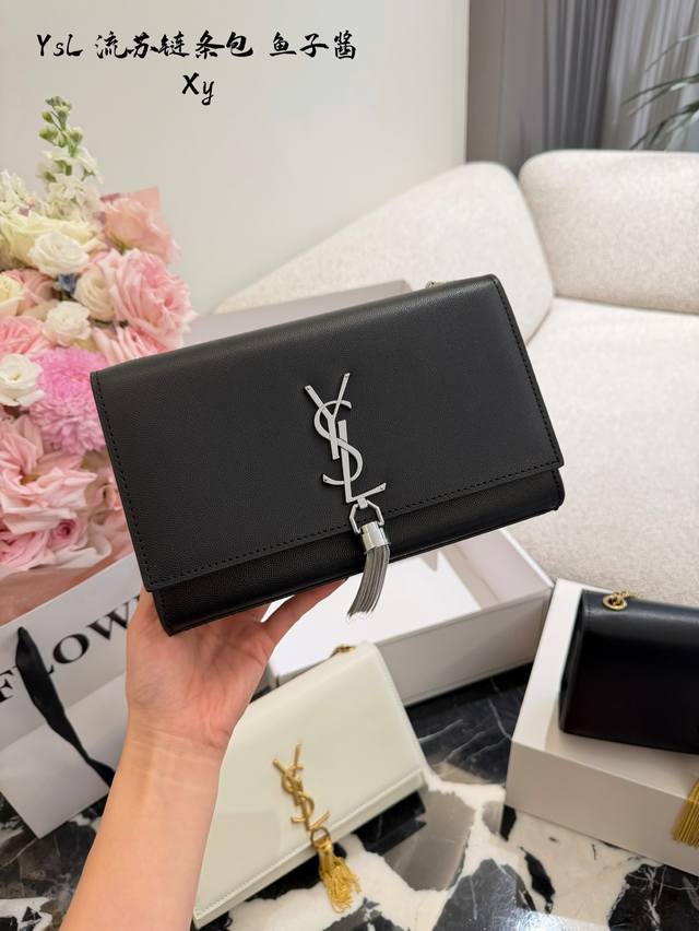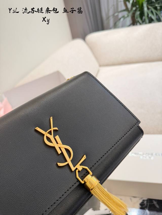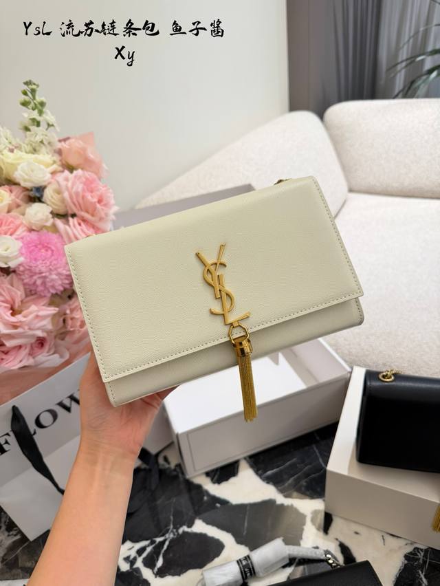 Caviar Ddd YSL Kate Tassel Chain Bag, cream-colored grained cowhide leather with a gold L.Ogo logo, embellished with metallic tassels, elegant and lively. The small size is approximately 23 x 12 x 5 cm, lightweight and practical, suitable for daily commutes or dates. The chain is adjustable, and it can be worn over the shoulder or crossbody. The interior space can hold a phone, lipstick, and other small items. The tassel design is highly recognizable, versatile and fashionable, easily matching both the gentle spring/summer style and the minimalist autumn/winter style. It's a classic piece that combines practicality and style. Double box with small mirror DDD