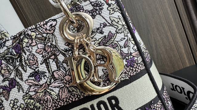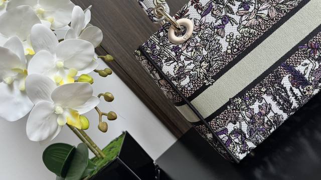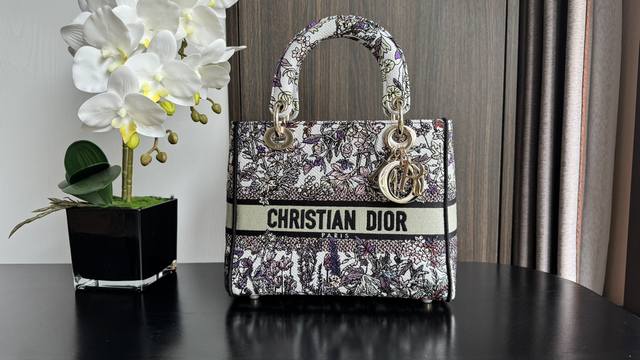 Dior Lady Dior D-Lite Handbag: New Winter Floral Embroidery with Dior 4 Saisons Hiver Design by Pietro Ruffo. This Lady D-Lite handbag blends classic elegance with modern style. The entire bag is adorned with a grey and white multi-colored Dior 4 Saisons Hiver embroidery pattern designed by Pietro Ruffo, showcasing winter flowers and plants, exuding a pastoral charm. A light gold-finished Dior charm adds a touch of dynamism to the exquisite silhouette. Medium size with a detachable embroidered wide shoulder strap, it can be carried by hand or crossbody. Features include: Christian Dior Paris logo on the front; detachable wide shoulder strap; interior zip pocket; large patch pocket; can be paired with other Dior embroidered shoulder straps; includes a dust bag; dimensions: 24 x 20 x 11 cm; style number: 6605.