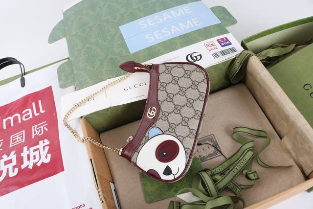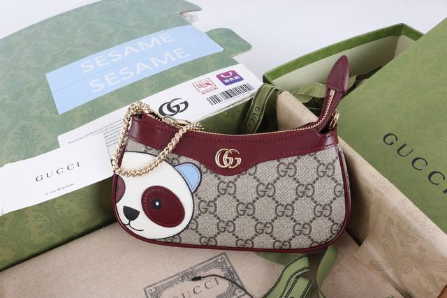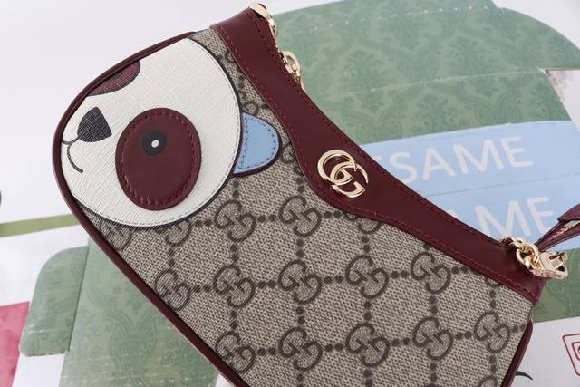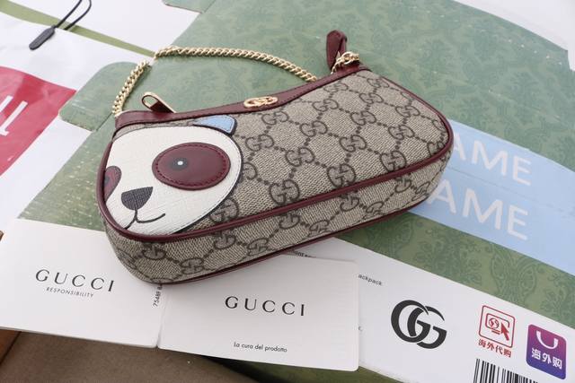 Factory direct, top-quality original leather, genuine single item with full boutique packaging. Description: This mini handbag features a delicate panda detail on the front, accented with multi-colored leather patches. The GG logo evolved from the diamond quilting of the 1930s and has since become a traditional symbol of the G brand. This small handbag in the new Ophidia series incorporates this highly recognizable G pattern into its design. Model 818763. Made with boutique-quality PVC waterproof fabric and imported cowhide, matching the genuine product on the market. Brass hardware. Dimensions: 10 x 19 x 3.5 cm. Sf-2018114Wq.