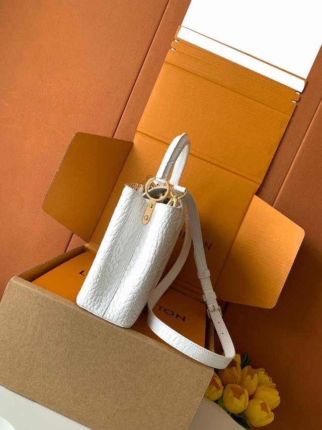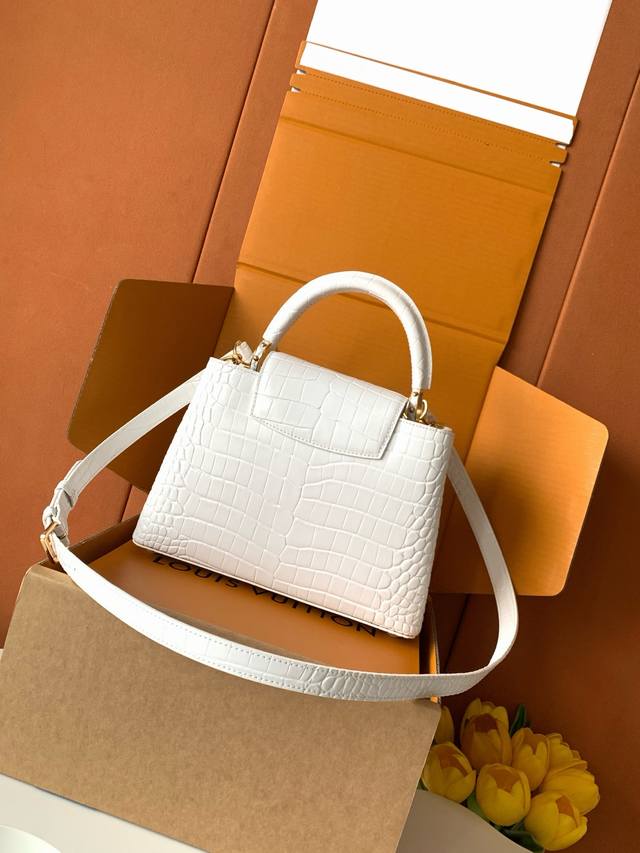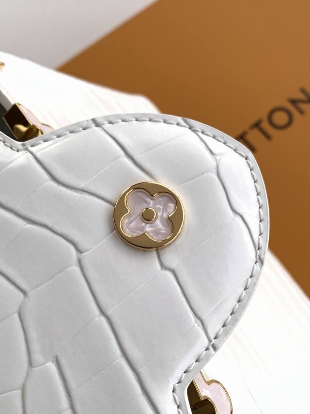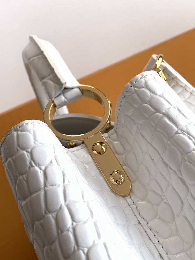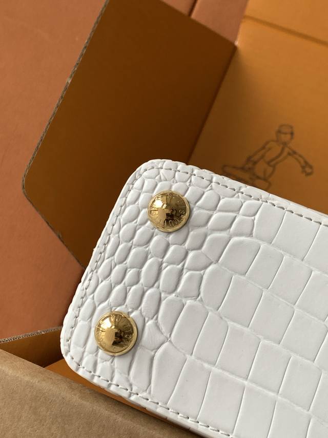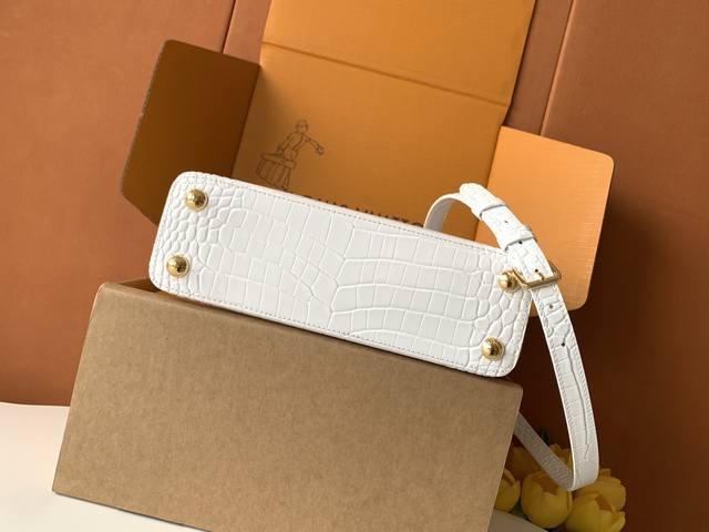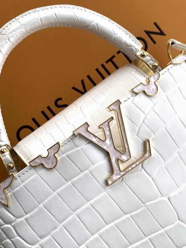 Factory Price p Premium All-Steel Hardware Exclusive Custom-Made Boutique Imported White Glossy Crocodile Gold Buckle M86154 Dynamic 163C Dynamic Code Ddd This Capucines BB handbag features a Monogram flower depicted in lustrous seashells blooming gracefully along the upper edge, complementing the jewel-like LV lettering and showcasing Louis Vuitton's elegant style. The top handle and detachable slim shoulder strap offer multiple carrying options. Ddd 27.0 X 17.3 X 9.0 cm Length X Height X Width Ddd