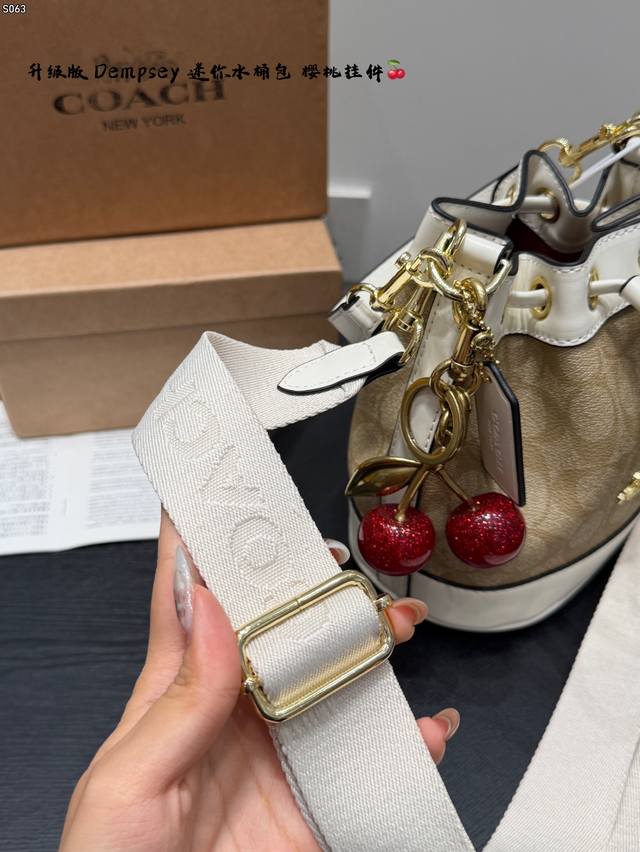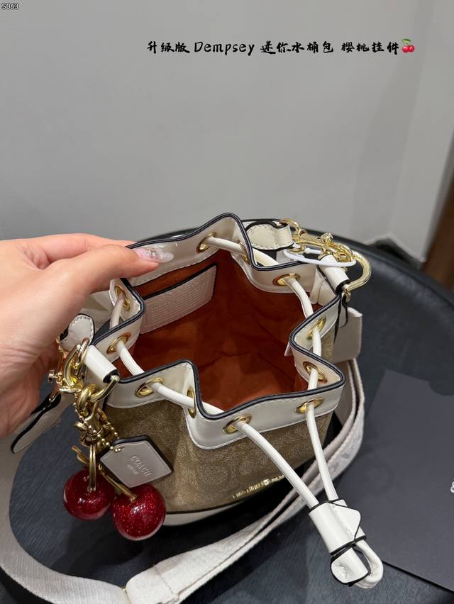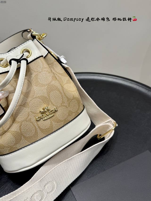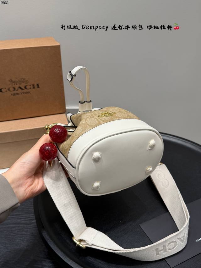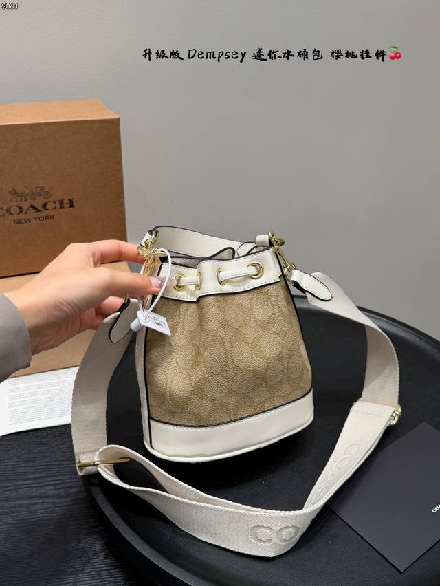 Gift Box Packaging! Upgraded Version! Coach New Dempsey Mini Bucket Bag with Knitted Wide Shoulder Strap! Super cute, can even fit plus-size items!!! I've been waiting so long for this! The patchwork bucket bag is a mini size with a drawstring design! This bag is perfect for summer~~~ So cute, such a adorable little cutie~~ Size: 16*17cm