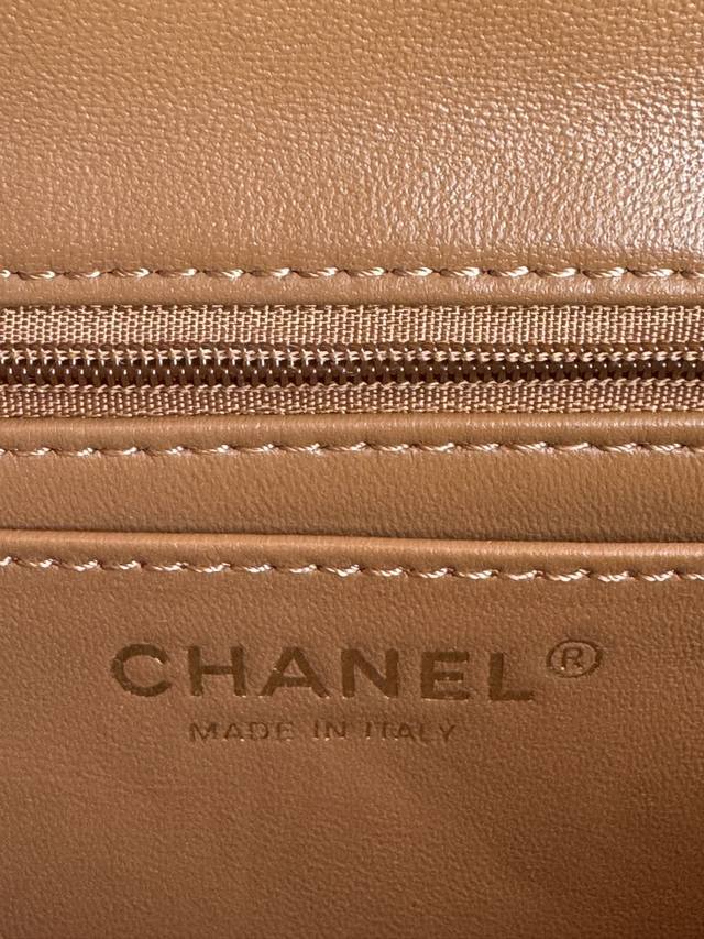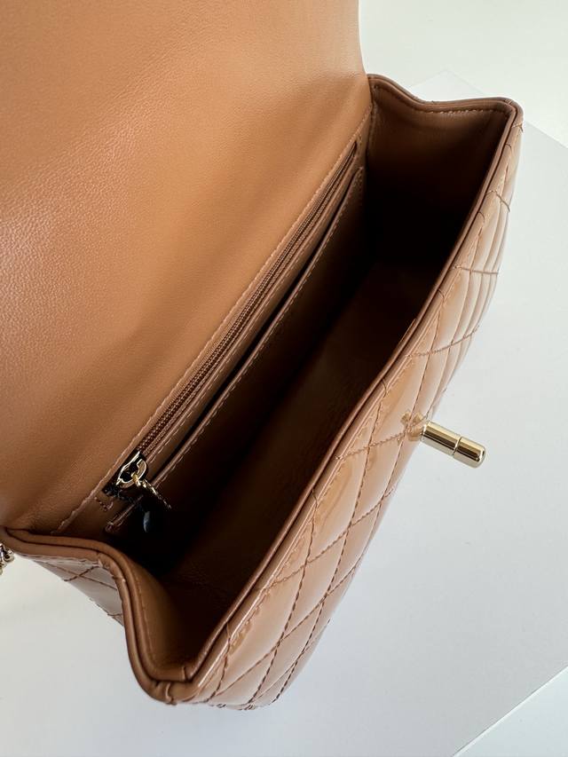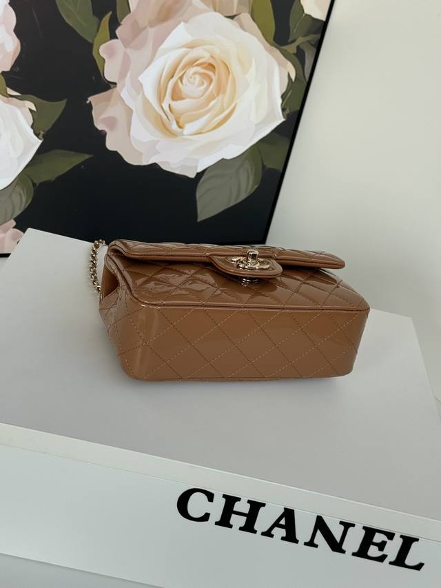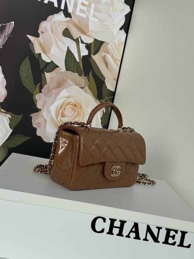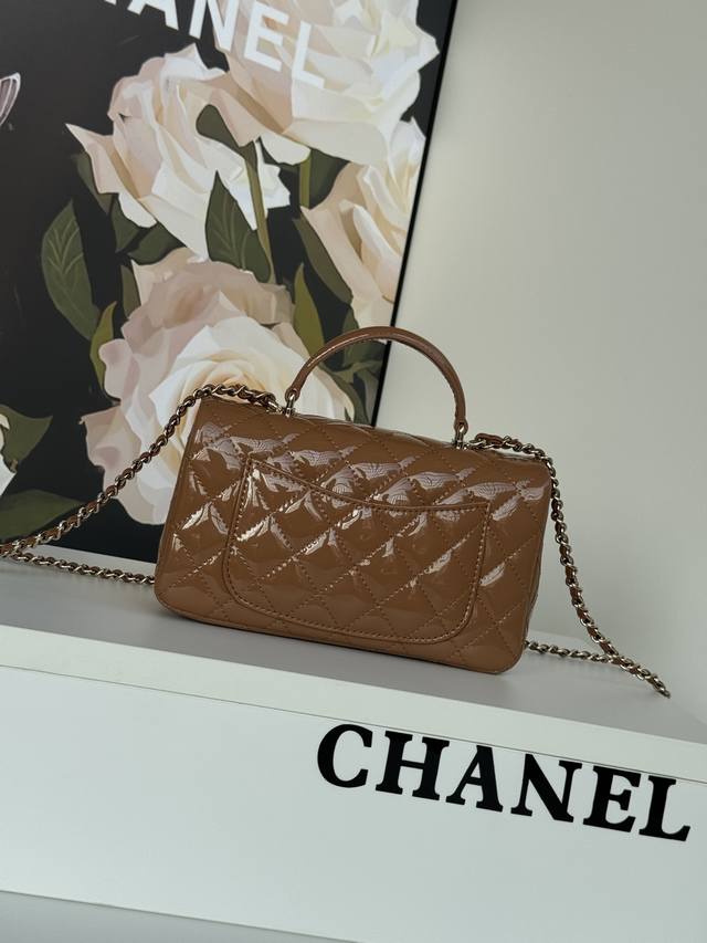 In Stock 25 Early Spring New Mini CF Handle Bag As2431. A classic quilted flap bag with a delicate classic chain handle. Made of supple patent leather, this handbag stands out and embodies timeless elegance. Dimensions: 20 x 12 x 6 cm.