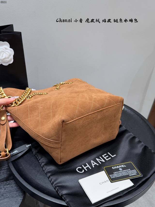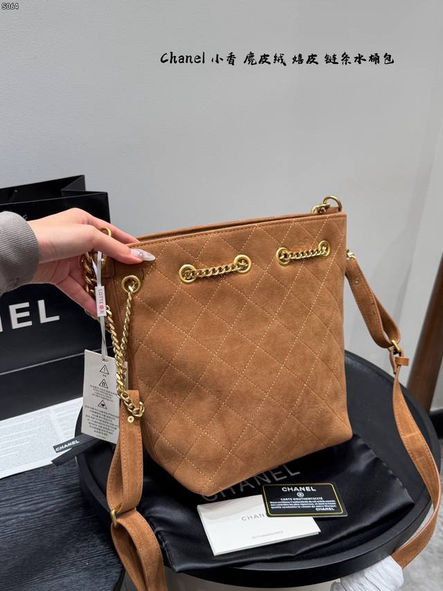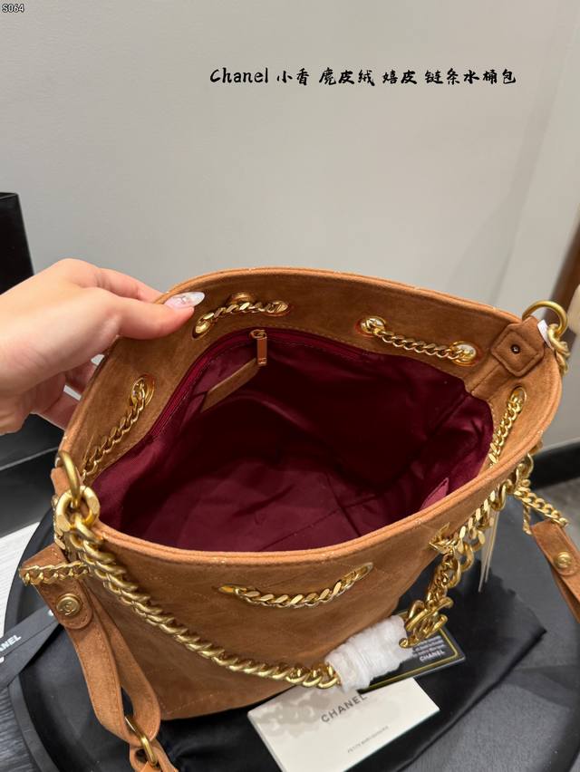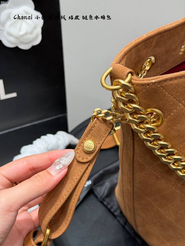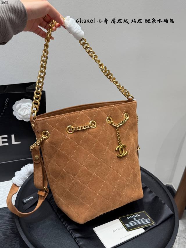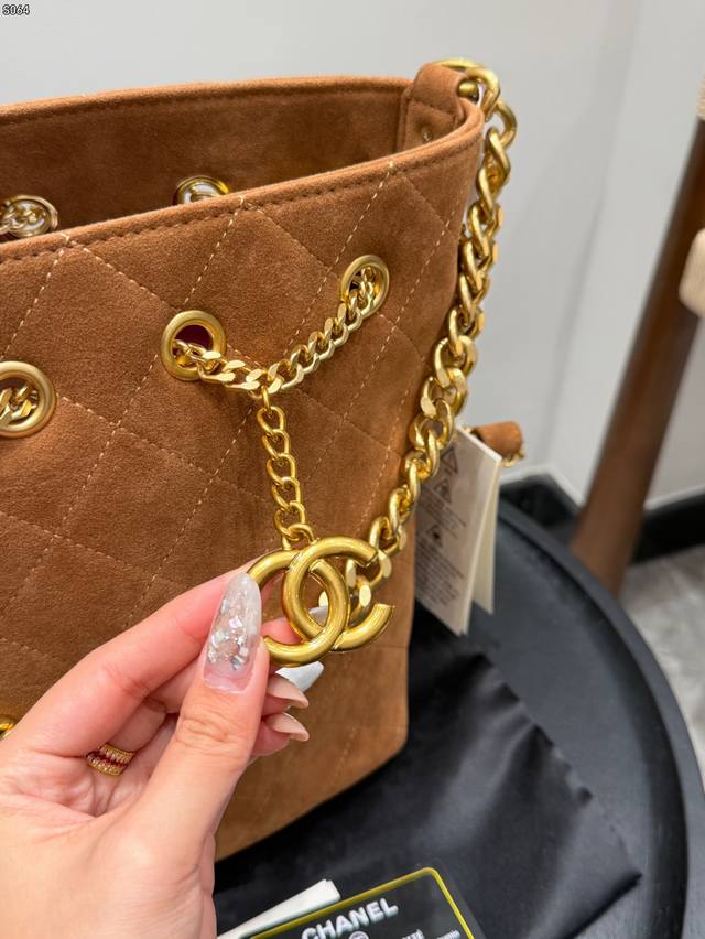 Looks good no matter how you wear it! Chanel Bucket Hippie Bag, Suede/Nuts. Hippie style really suits me!! Compared to Chanel's classic CF, Gabrielle, and 19 Bag, I prefer this slightly less popular seasonal style. It's a unisex style that both men and women can wear. The black and gold color scheme, the double C logo pendant, is very exquisite. Wearing it makes me feel energetic!! Size: 20 x 27 cm.