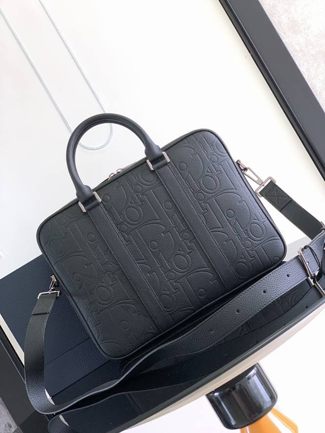 Original Background. This briefcase is a new addition to the Fall 2024 menswear collection, seamlessly blending classic elegance with Dior's haute couture spirit. The Dior Gravity printed leather features an embossed pattern that exquisitely presents the classic motif on black calfskin, accented with tonal grained calfskin details. The front is adorned with the Dior logo, showcasing the exquisite craftsmanship of the Dior ateliers. It has a zip closure, a spacious interior with a quilted laptop compartment, and comes with a foldable handle and an adjustable, detachable shoulder strap, allowing it to be carried by hand, over the shoulder, or crossbody. Ddd Nylon lining Ddd Zippered main compartment Ddd Flat internal laptop compartment Ddd 2 internal slip pockets Ddd Leather top handle Ddd Adjustable, detachable leather shoulder strap with lobster clasp Ddd Front metal-coated brass Dior logo Ddd Embossed Dior logo inside Ddd Includes dust bag Ddd Made in Italy Ddd Dimensions: 37 x 28 x 6 cm (L x H x W) Ddd The main compartment can hold one 13-inch laptop, one tablet, and A4 documents Ddd Item Number: 1Esbr180Cdp DDD