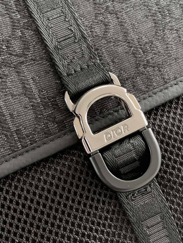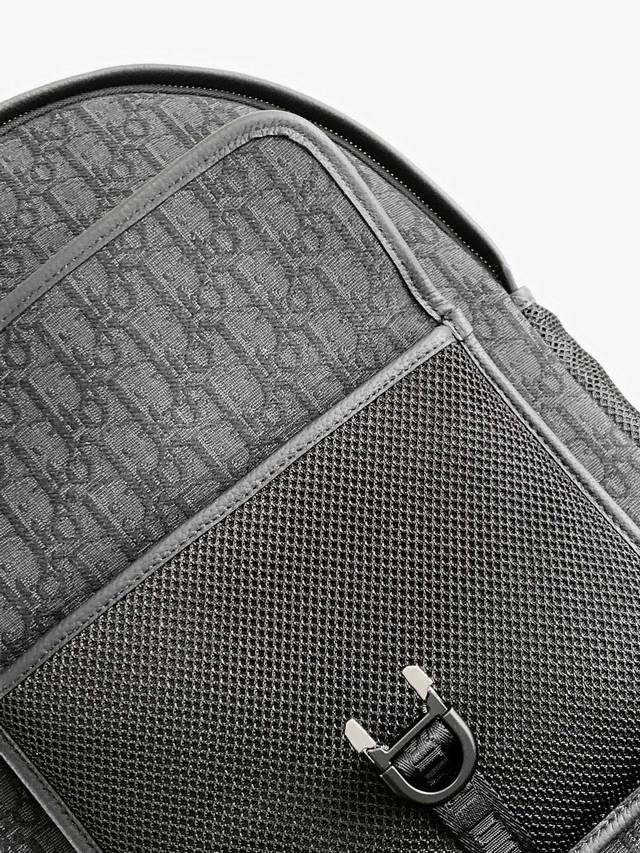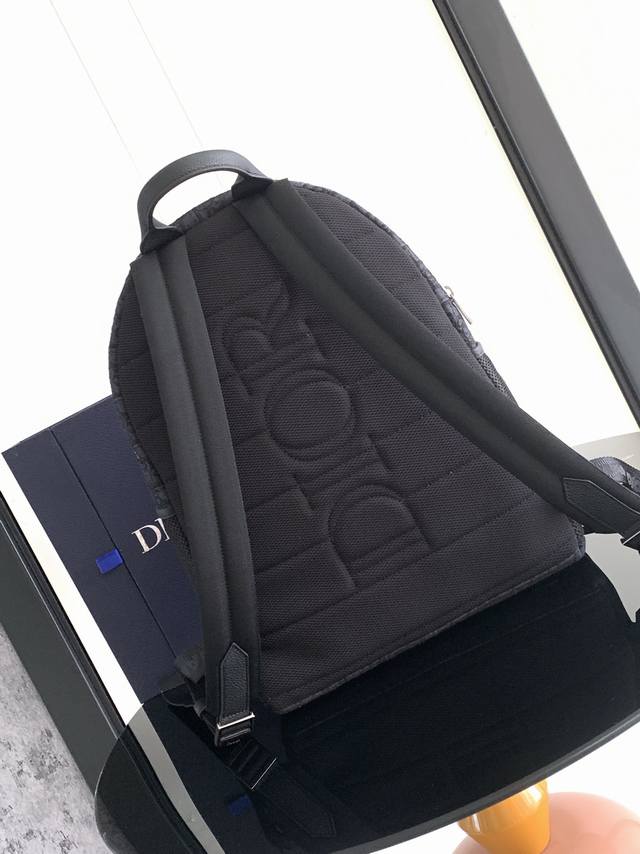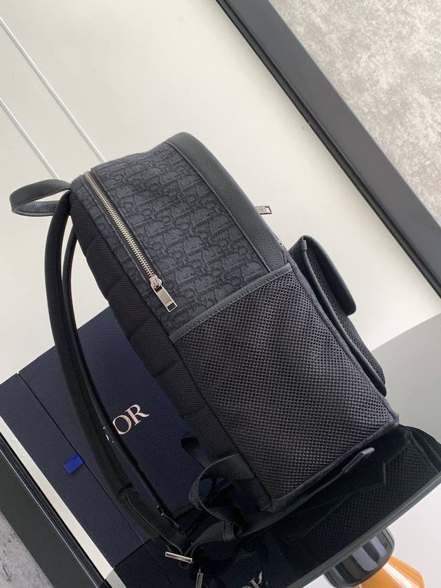 Original background. This Dior 8 backpack is a new addition to the Spring 2024 menswear collection, featuring a stylish and modern design with a touch of elegance. Crafted in black Oblique print, it boasts a spacious main compartment for everyday essentials. A zippered laptop pocket is located at the back, while the front features a jacquard and mesh fabric pocket with a Dior 8 snap flap for added sophistication. Side pockets are also included. This practical backpack complements a variety of looks. Black Oblique print Dior bag with front brass Dior logo, interior embossed Dior logo, top zip closure, adjustable padded shoulder strap, leather top handle, back reinforced with quilted technical knit fabric and Dior logo, front technical knit fabric pocket with flap and Dior 8 clasp, side slip pocket, laptop zippered compartment, includes dust bag, made in Italy. Item number: 1Eiba178Yky_H03E. Dimensions: 31 x 41 x 15 cm (L x H x W).