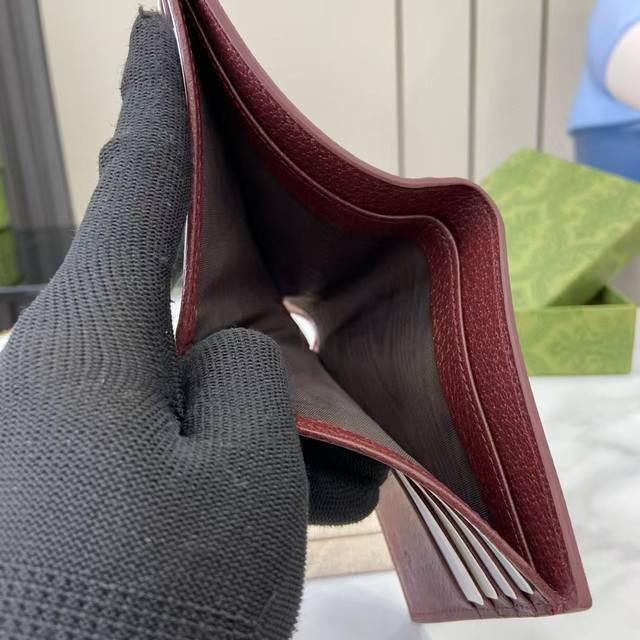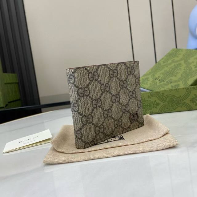 Top-of-the-line Gg detail wallet. Gucci small leather accessories push design boundaries, constantly reinterpreting classic pieces in a personalized way. This men's wallet skillfully blends classic Gg Supreme canvas with red Gg hardware, creating a sophisticated modern accessory. Beige and ebony Gg Supreme canvas, black leather trim, brass hardware, black ceramic-effect finish, cloud-patterned fabric lining with Gg details, interior: 10 card slots, 1 bill compartment. Model: 768243. Closed dimensions: 11cm wide x 9cm high. Opened dimensions: 21cm wide x 9cm high. Color: Burgundy brown PVC. Made in Italy. Weight: Approx. 0.045kg.