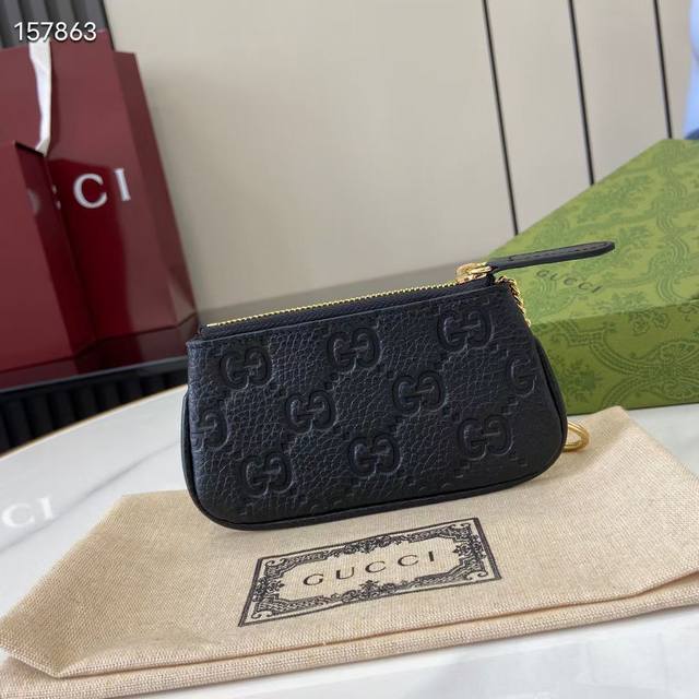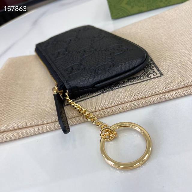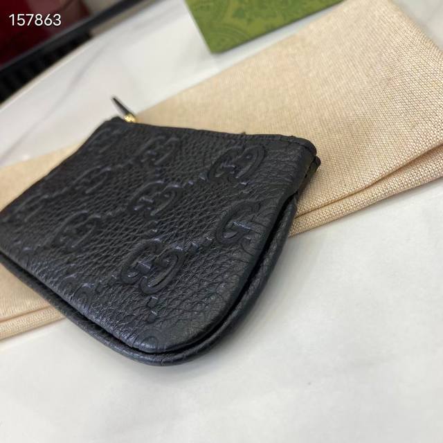 Top-of-the-line new Gg Emblem series ultra-soft lychee embossed full leather coin purse. Model: 815891. Size: 12cm (L) x 7.5cm (W). Color: Black, original full leather. Italian design.