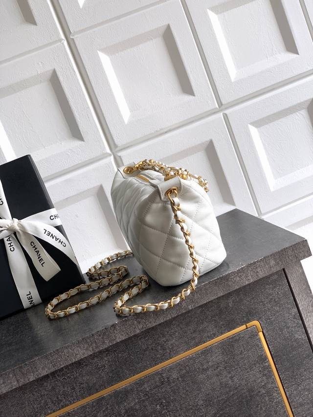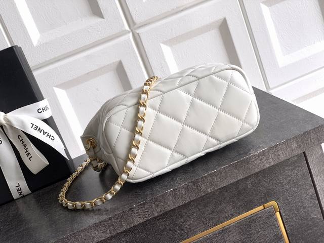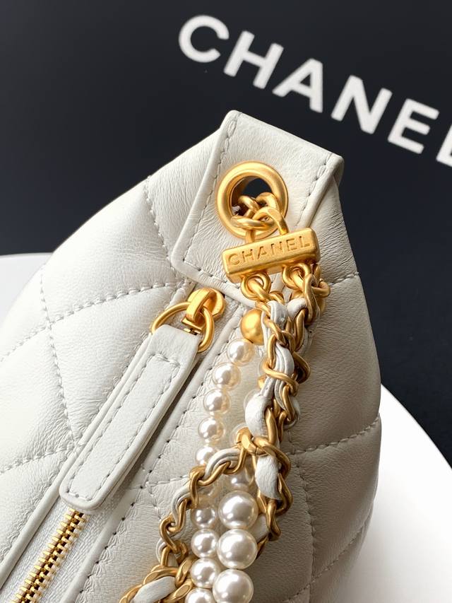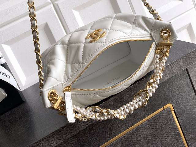 Top-quality original Ohanel 26C series pearl chain lunchbox bag in white, featuring a classic quilted pattern, vintage lambskin leather, and a metal chain adorned with pearls. Elegant yet modern. Hobo style, moderate capacity, can hold a phone and lipstick, perfect for commuting or going out! Adjustable shoulder strap, easily switch between shoulder and crossbody wear. The pearl chain is incredibly dynamic, adding a touch of elegance with every step. The black and gold color scheme is understated yet luxurious, practical and stylish. Dimensions: 13-23.5-7.5 cm. Comes with packaging.